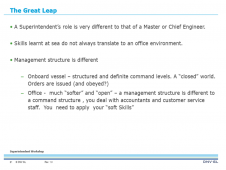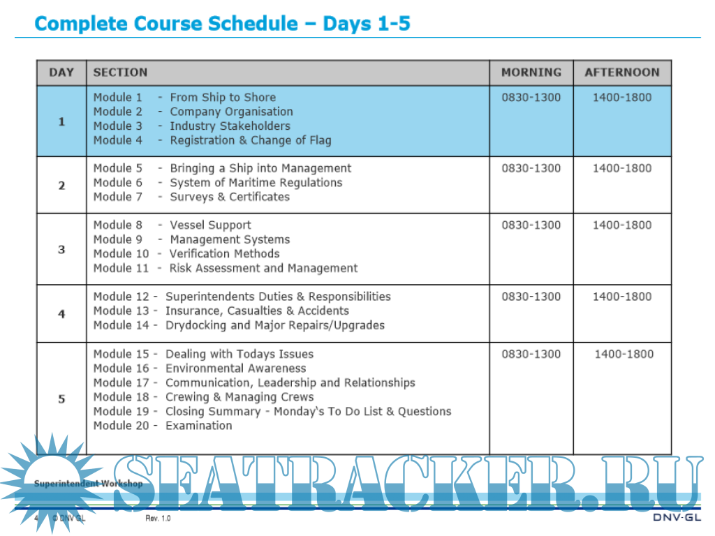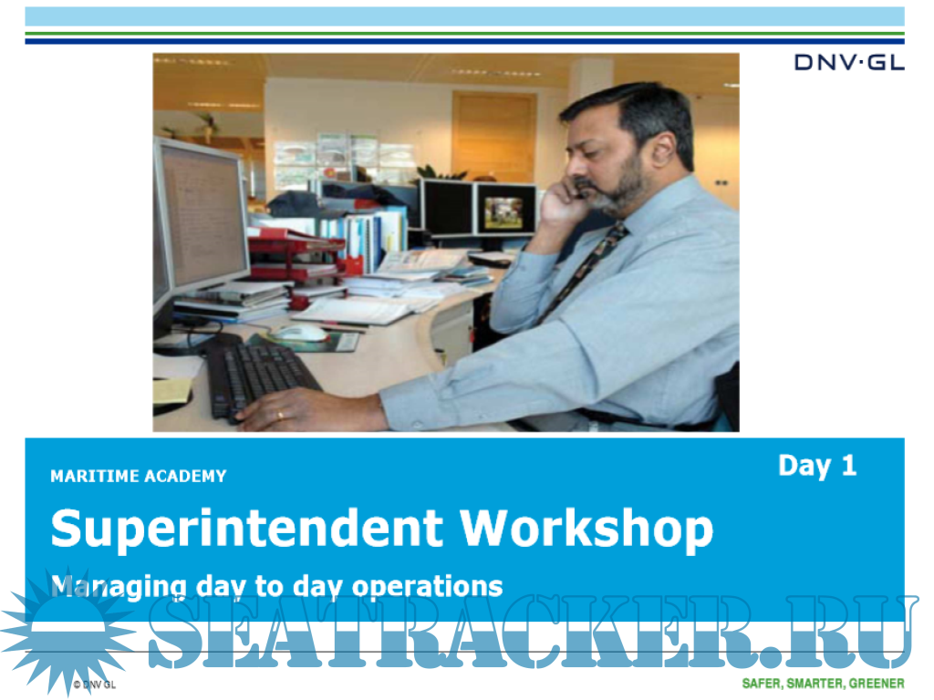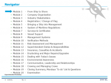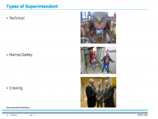 The last day deals with the usual tasks of a superintendent in the day-to-day operation of the vessel including maintenance and cost control. Case studies promote an interactive approach in the conduction of the course.