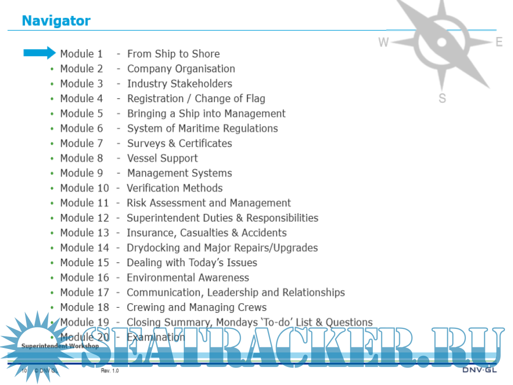 This five-day practical course starts with a basic introduction to the role of a superintendent within the organization of a shipping company and the interrelation of the company with other stakeholders in the shipping industry.