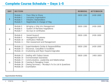 Day four deals with crewing matters covering the legal and management requirements for crewing the vessel. The second half concentrates on ships in emergencies, accidents, casualties and their investigation and measures to minimize risks.