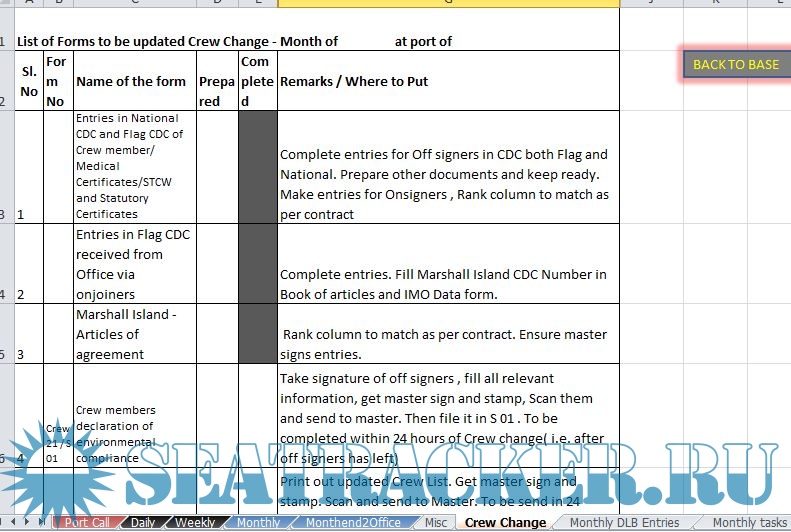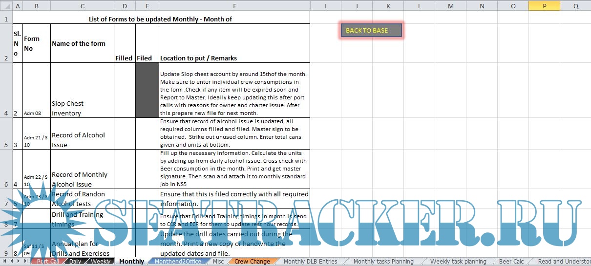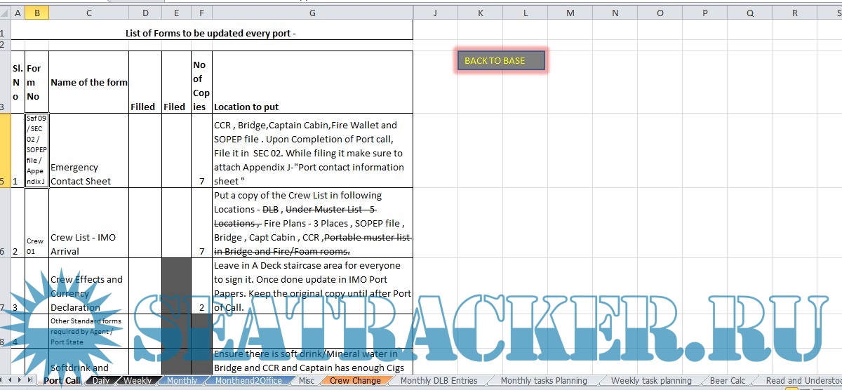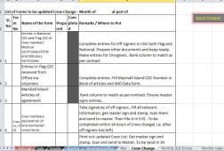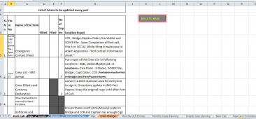 Description: These are a collection of excel files that I used as a third officer to keep track of my work. The works are divided into various scenarios - Port Call , Daily , Weekly , Monthly , Month end to office etc. Third mate is in charge for collecting crew documentation. Hence this excel file also contains documents to be collected from each rank.