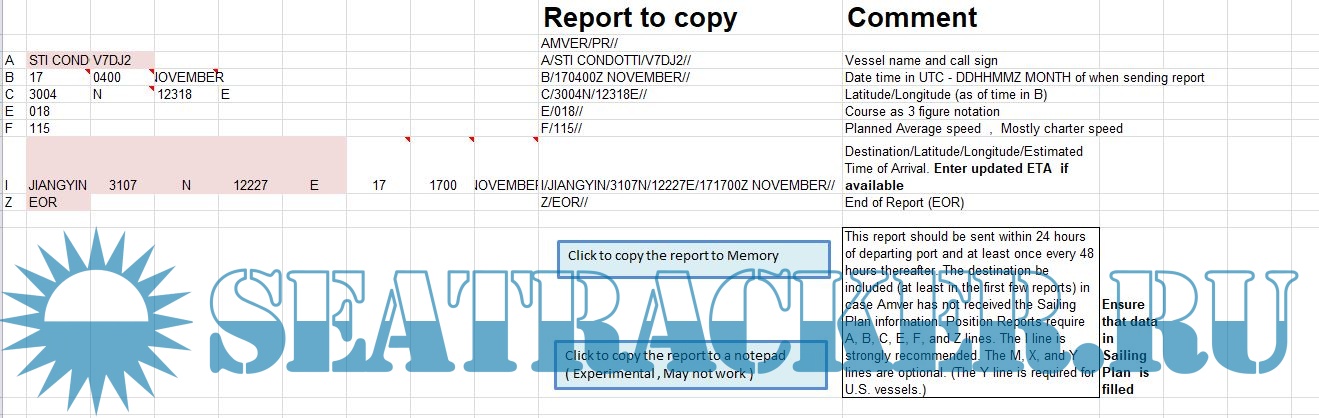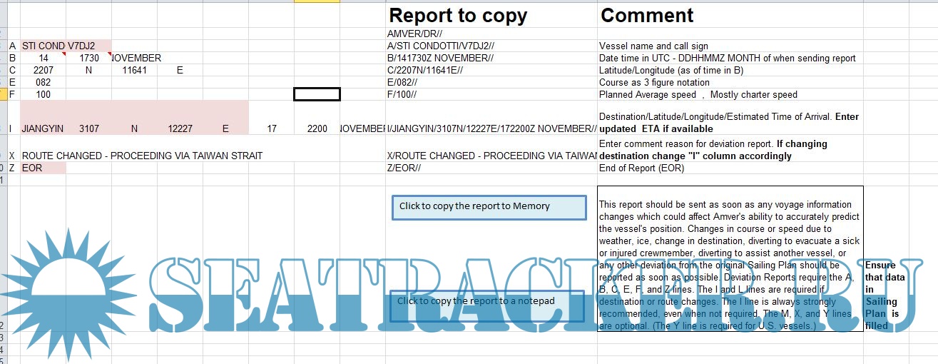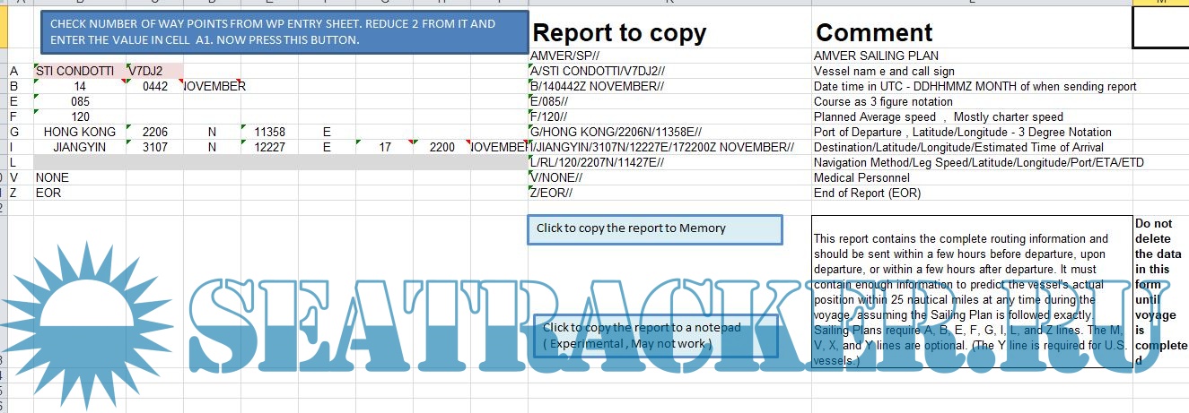 Description: This is a program I made to make AMVER reporting easier. Just export the route from ECDIS into csv fromat , paste it in excel , add a few necessary details and press the button. Thats all you have to do. I made it because I have seen second mates spending a lot of time for making AMVER report.
