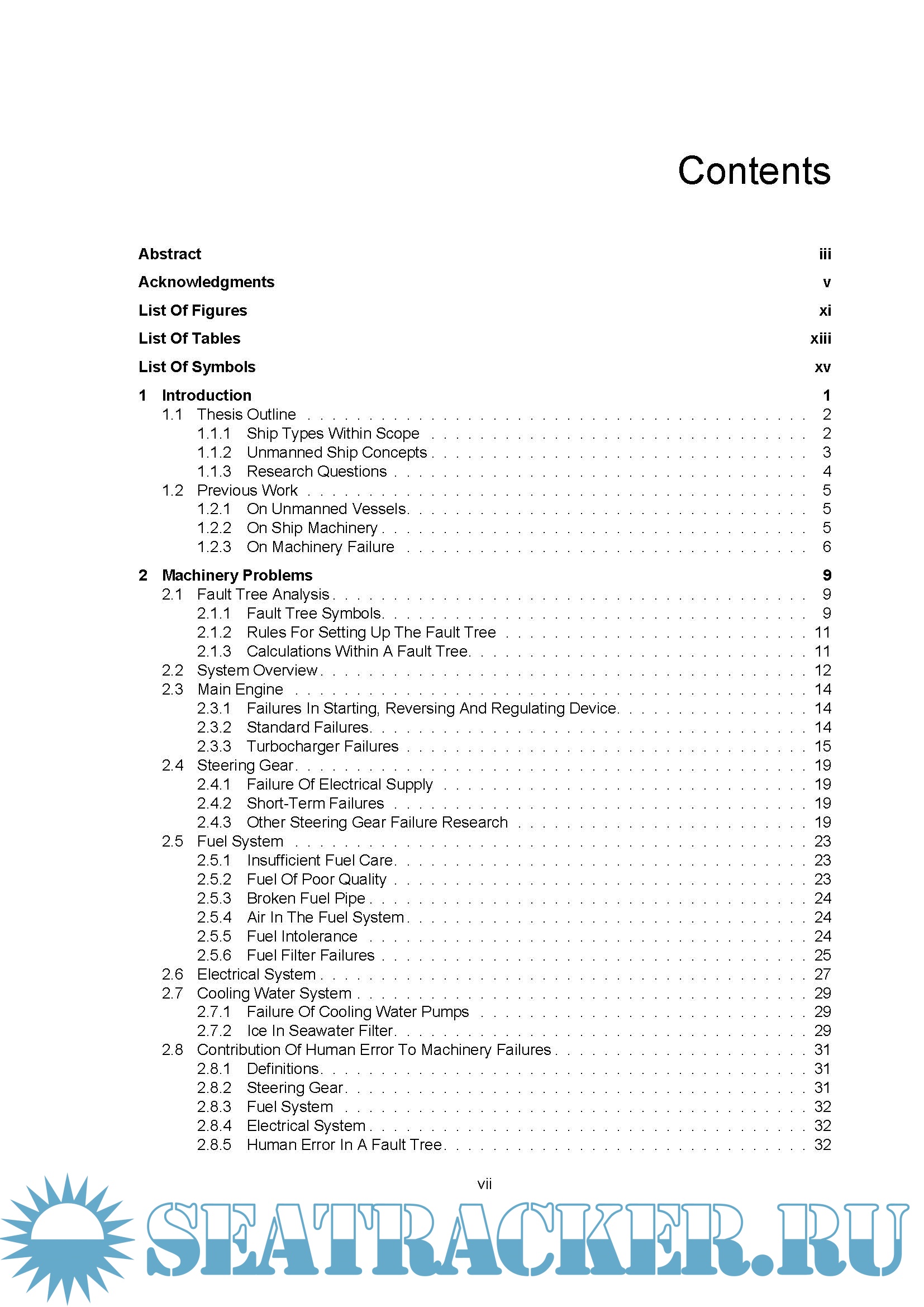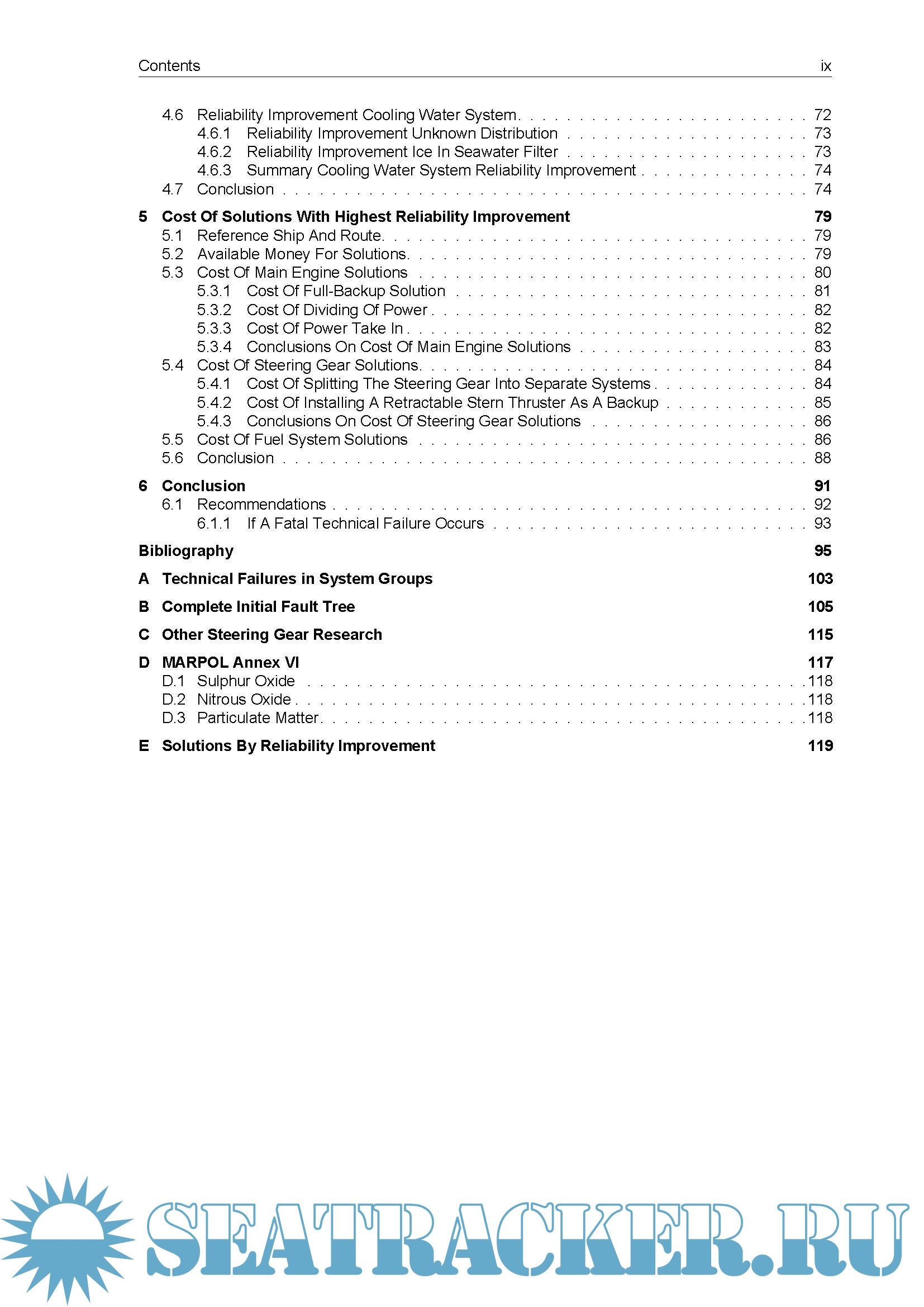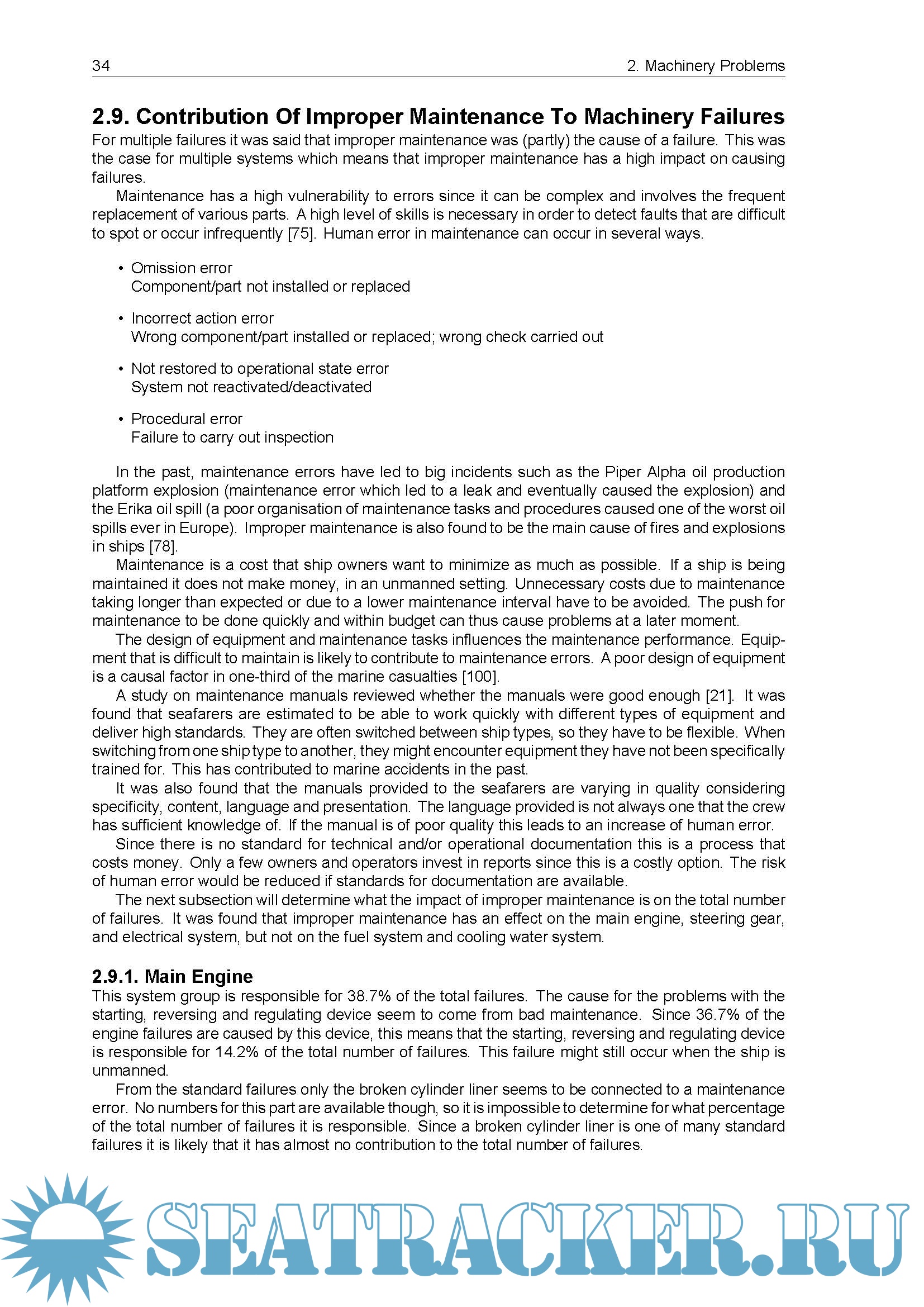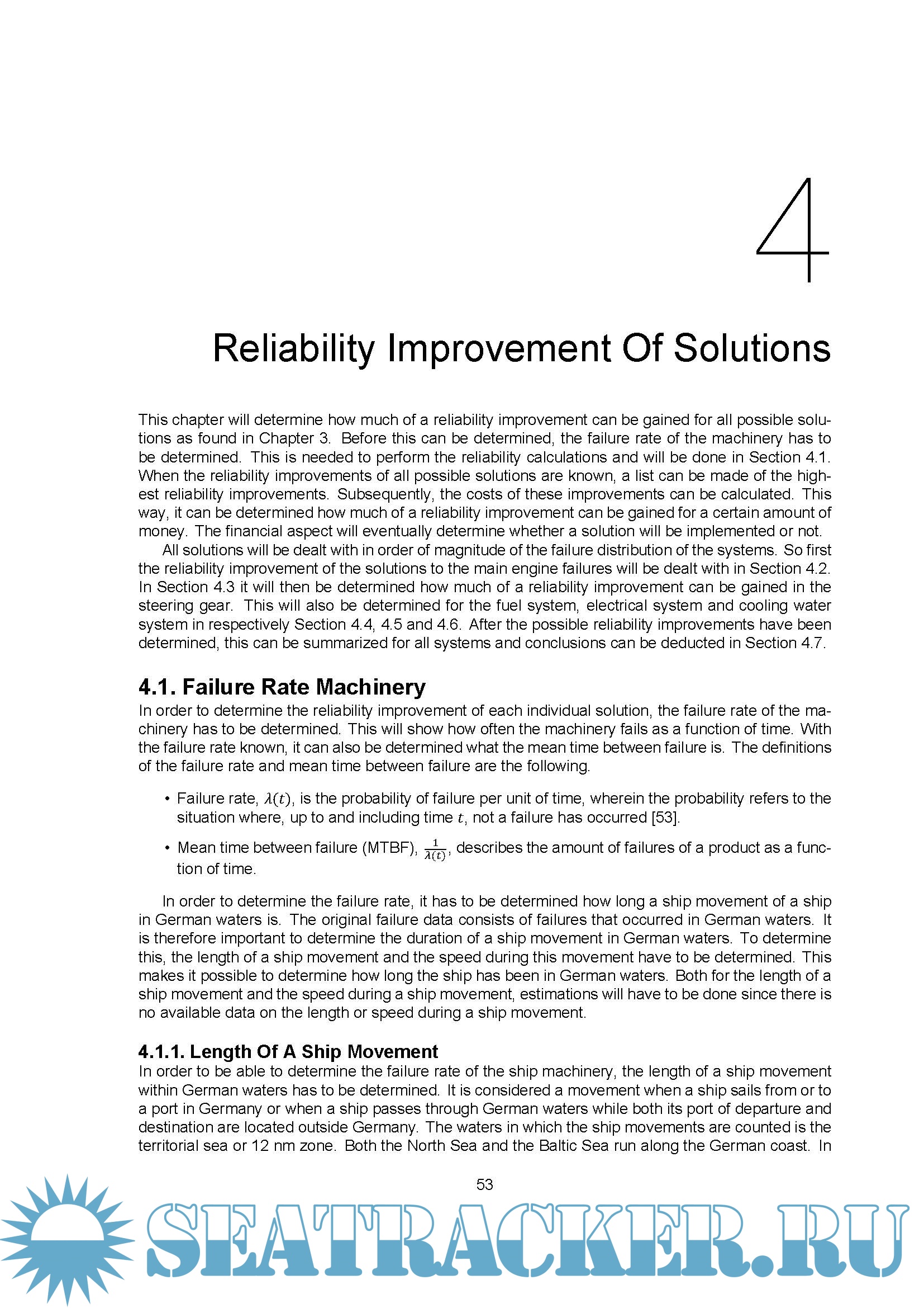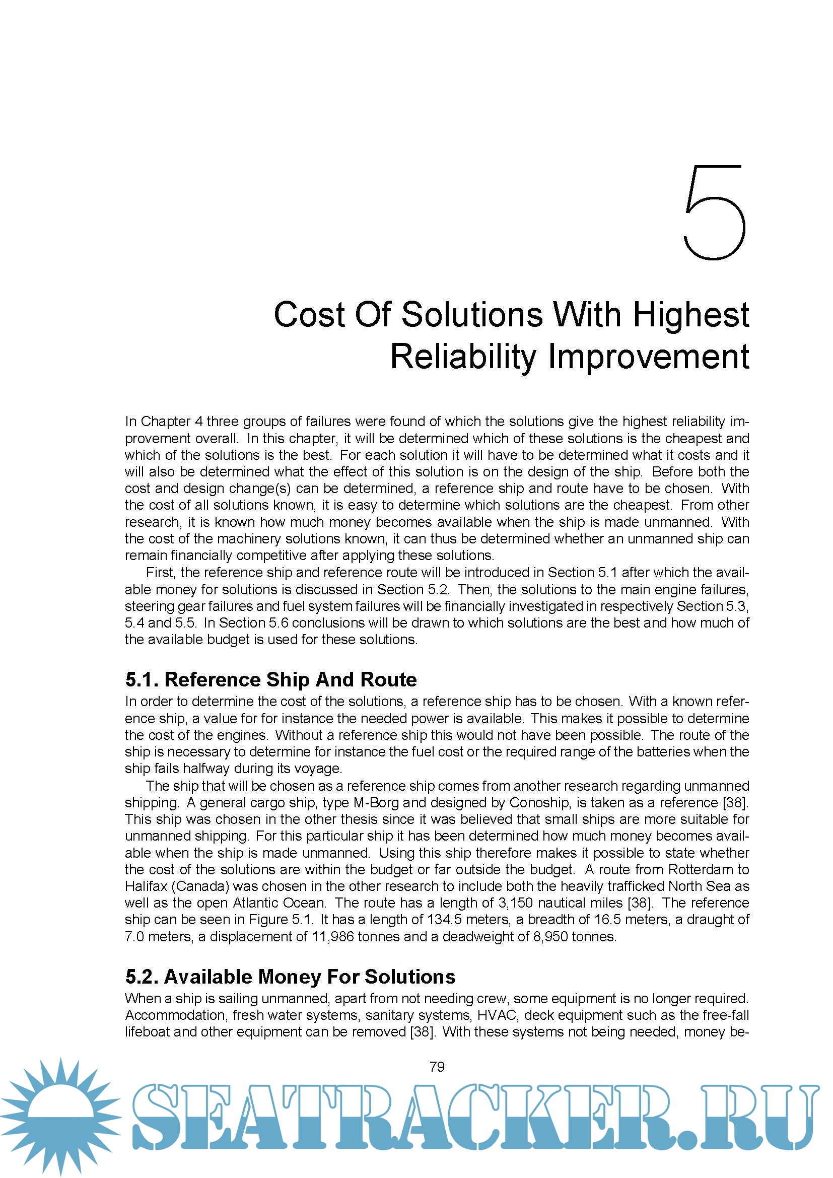 Description: Due to the increasing seaborne trade, shortage of officers, constant work of crew on machinery during voyage and the large contribution of human error to shipping accidents it is time for shipbuilding to take the next step in automation. Unmanned shipping is the way to move forward and since the engine room houses some of the most important machinery in the ship, this is the equipment which has to be made more reliable first. Improving the reliability of ship machinery is the goal of this thesis, and this will be done for ship types with a simple design and relatively simple equipment, namely general cargo ships, container ships, bulk carriers and oil and chemical tankers. In order to increase the reliability of the machinery, it will first have to be determined which failures occur to the machinery. The main engine, steering gear, fuel system, electrical system, cooling water system, diesel generator, shafting and other have all been found to be responsible for fatal technical failures in the past. Since these first five systems are responsible for the largest part of the failures, the focus of this thesis will be on these systems. These systems are crucial for the actual sailing of the ship, so making these systems more reliable makes great effort regarding unmanned sailing. With the failures known, solutions have been developed for each individual failure. These solutions should have an equal or higher reliability compared to the initial solution. For the found solutions it can then be determined what their reliability improvement is. Determining the reliability improvement is done by knowing the failure rate of the machinery, which has also been determined. A list can then be made to determine which solutions provide the most reliability improvement. The cost of the best solutions is calculated next. In order for the unmanned ship to sail the oceans in the near future, it has to be financially competitive to the manned ship. When looking at the causes of the failures it was found that human error and improper maintenance are both responsible for almost 20% of the failures. Performing better maintenance was though not found to realize much reliability improvement, just as an alternative solution was not found to realize much reliability improvement. Solving the maintenance related failures or choosing an alternative system is thus not the best solution to the failures. The best type of solution was found to be a type of redundancy. Solutions to the main engine failures, steering gear failures and fuel system failures were found to achieve the most reliability improvement. This was to be expected since these systems are also responsible for the highest number of failures. When making a ship unmanned, equipment such as accommodation, fresh water systems, HVAC and others do not have to be installed. Money that does not have to be spend on this equipment is the budget for the reliability solutions. The cost of the three solutions with the most reliability improvement was found to fit perfectly within the budget that is available. It can thus be concluded that it is possible to increase the reliability of ship machinery while staying financially competitive to the manned ship. Budget is then also still available to pay for other systems that are needed for unmanned shipping. Redundancy was found as being the best type of solution. If all the best solutions are applied, the machinery would have a mean time between failures of nine years. Finding solutions to the diesel generator failures, shafting failures and other failures is needed to increase the reliability even further. In order to improve the reliability of the machinery even further, more detailed failure data has to be known. Of half of the failures there is currently not enough information. Better knowledge of the failure distribution will help to determine better solutions. It also helps to know to what ship types these failures occurred to. Failures in redundant systems are not within the failure data. Having this data really helps to get a better view of the problem. Knowing what failures the crew prevents during operation and knowing more precisely which failures they induce also helps to get more detailed knowledge of the machinery failures. If better failure data is available, a more detailed failure rate can be determined. When it also known which level of reliability is required, the more detailed failure rate can be used to determine whether this level of reliability can be reached. The here named advises would though all require extra research and are therefore recommendations for future work.