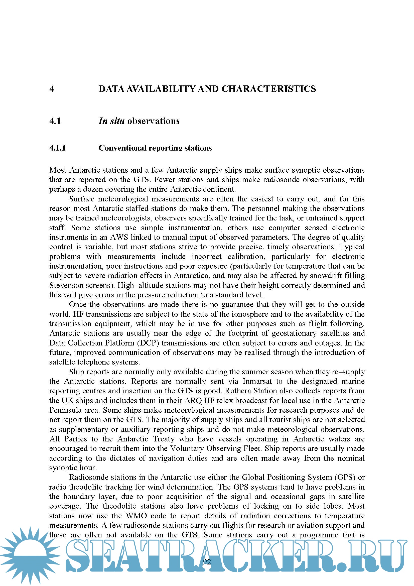 Data availability and characteristics. The lack of in-situ data is one of the main problems facing forecasters in the Antarctic so it is essential to maximise the use of the data that are available. However, many observations, such as the surface wind measurements, only reflect local conditions, and not the synoptic-scale flow. This section considers the value and error characteristics of each form of data available and provides recent maps of the locations of the staffed stations and the automatic weather stations. The value of the model analyses and forecasts are also considered.