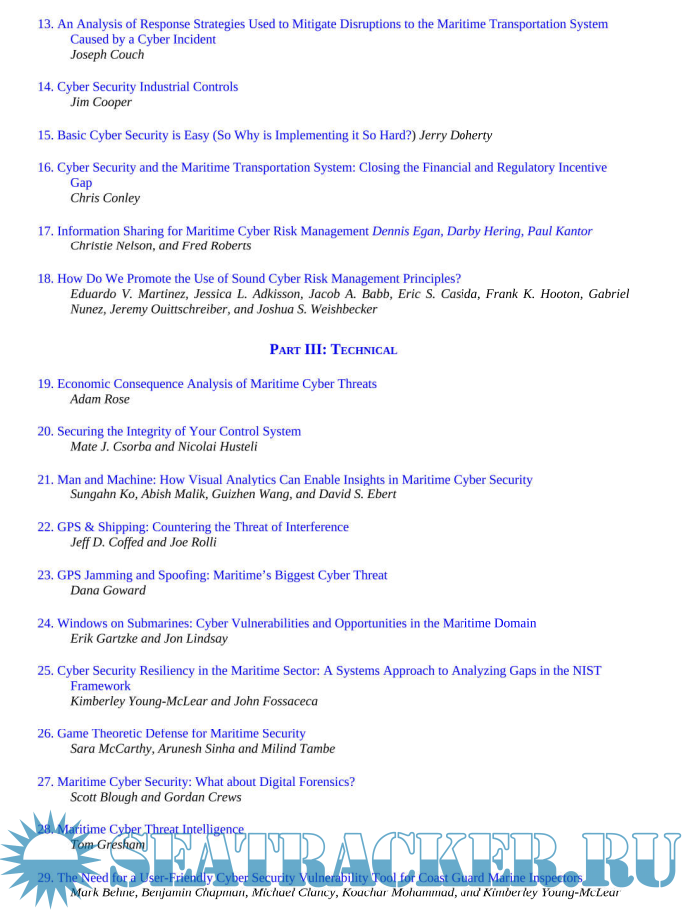 Year: 2017 Language: english Author: Fred S. Roberts Genre: Research papers Publisher: Westphalia Press ISBN: 1633915557 Format: PDF Quality: eBook Pages count: 380 Description: The world relies on maritime commerce to move exceptionally large portions of goods, services, and people. Collectively this effort comprises the Maritime Transportation System or MTS. A major component of this daunting multi-faceted enterprise are cyber networks, and the infrastructure they control. From the complex programs managing the loading and unloading of containers to waiting trucks, to the global navigation systems onboard vessels, to the hydraulic valves designed to protect spills into waterways that are located and controlled by cyber systems within chemical, water/wastewater, or petroleum plants, the MTS is becoming increasingly automated. The impact of the cyber element on the international MTS is significant. Yet, with the clear advantages this brings, come vulnerabilities and challenges. Researchers have demonstrated that it is possible to remotely take control of a vessel by spoofing its GPS. The news has reported attacks that shut down a boating oil rig by tilting it. The electronic positioning so ware systems on ships are vulnerable to attacks that could modify files and charts, causing potential for serious damage. The complexity of the problem of making our MTS safe from cyber attack is daunting, and the need for all stakeholders in both government (at all levels) and private industry to be involved in cyber security is more significant than ever as the use of the MTS continues to grow.