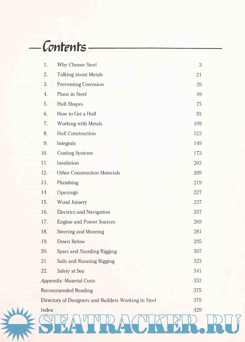 Whether you 're an armchair dreamer, an intermediate adventurer, or a genuine salty dog, we hope that this guidebook has something for you. The emphasis is on providing information to help anyone organize a logical plan to obtain and outfit a steel boat. Since the internal organization of the book is in approximately the same order in which you'd put a cruising sailboat together, you can pick it up at any stage. If you're building a complete boat yourself, most of the decisions you'll have to make are outlined and discussed. If you're having a boat built, you 'll be able to understand what the designer and builder are talking about, so that you can participate more effectively in the process. If you 're already designing or building steel boats, there should be some food for thought.
