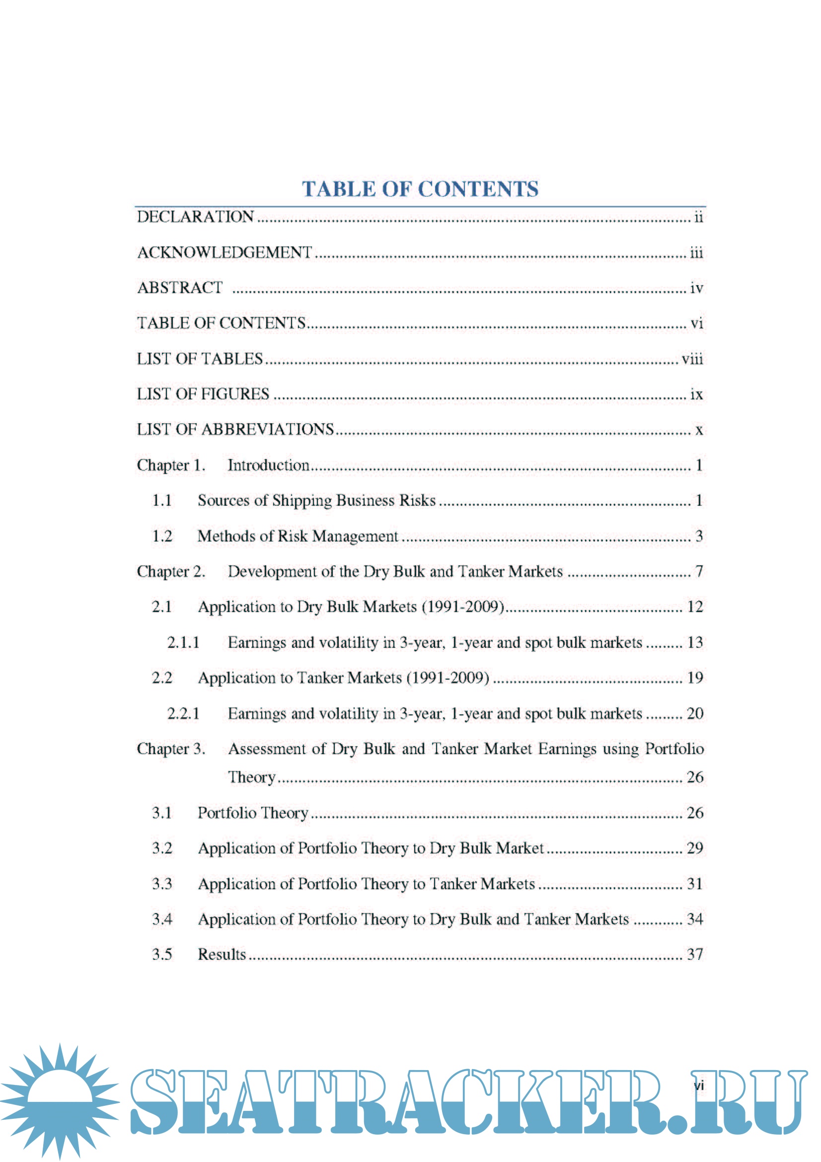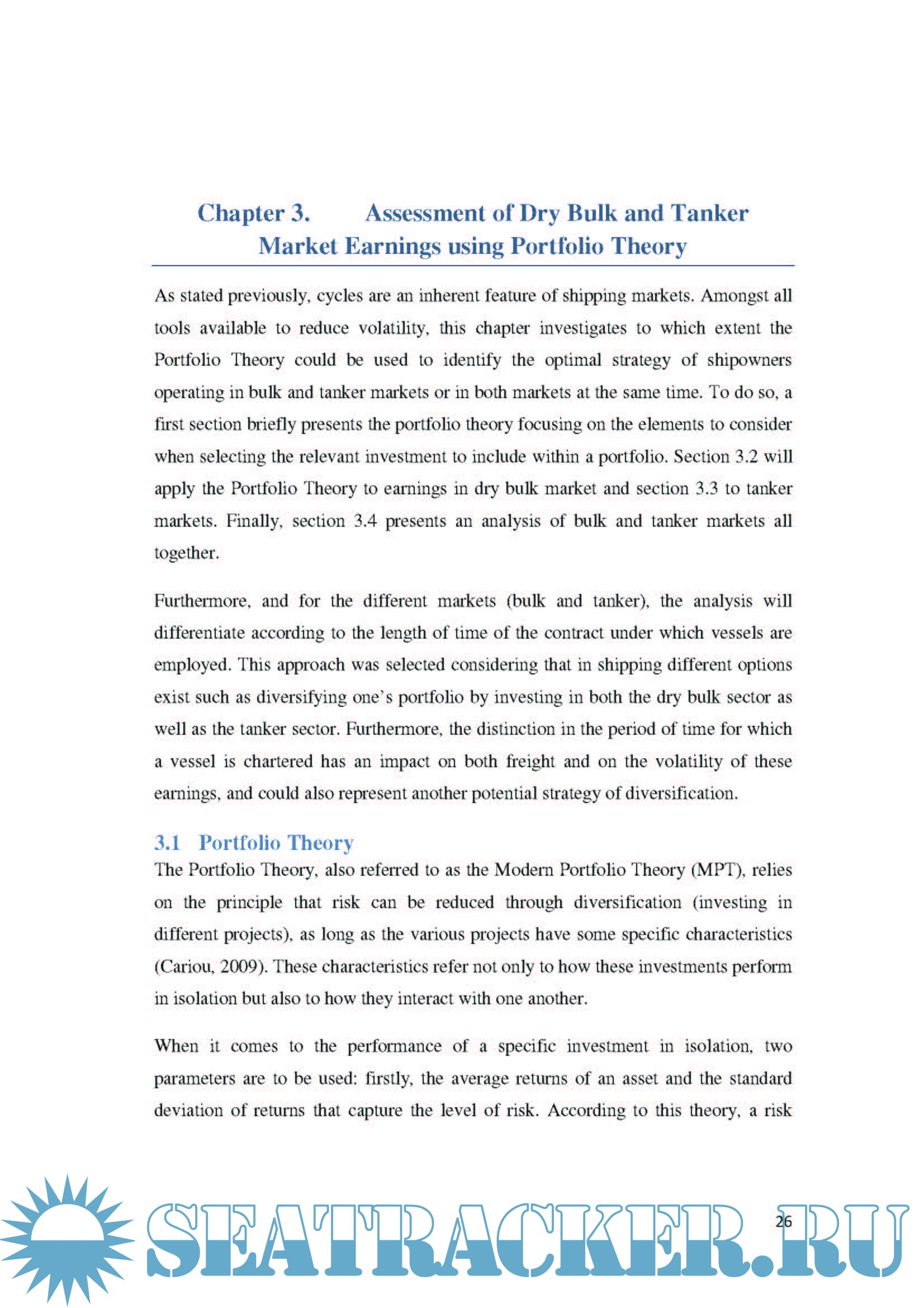 Traditionally, an investor in the maritime transportation industry would seek to spread this risk by diversifying the assets in which he invests, which for the purpose of this dissertation are dry bulk and tanker vessels. Ships are therefore considered assets which form a portfolio and the degree to which a portfolio is diversified or specialised depends on the type of vessels included in a fleet. Furthermore, vessels may be fixed on the spot market or the time charter market, which affects the volatility and the earnings that an investor would expect.