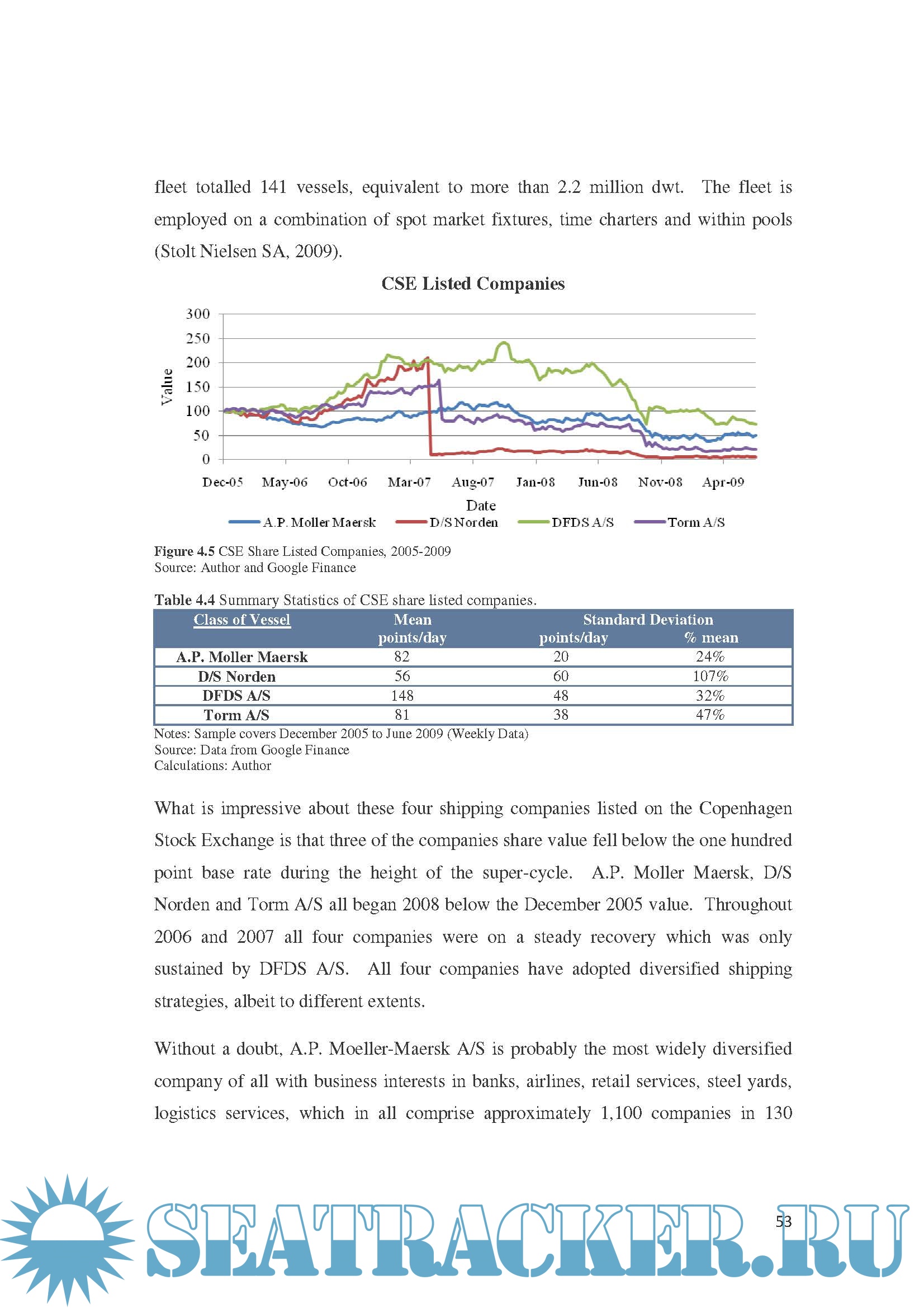 Additionally, another in depth analysis is carried out of companies involved in maritime transportation which are listed on five different stock exchanges in Europe and the United States of America. By analysing each company’s share value and volatility between 2005 and 2009, the Capital Asset Pricing Model can then be applied to determine how the company performed. A comparison of each company’s performance with market freight rates allows for a conclusion to be drawn on the impact each strategy had on a company’s share price and beta value.