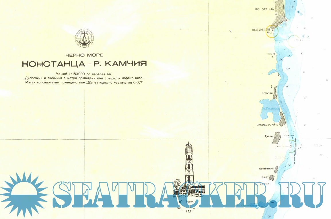 3. The title of the chart(in bulgarian) - Konstantsa - Kamchia. The scale at parallel 44°, the magnetic declination for year 1990 with the increasement per year.