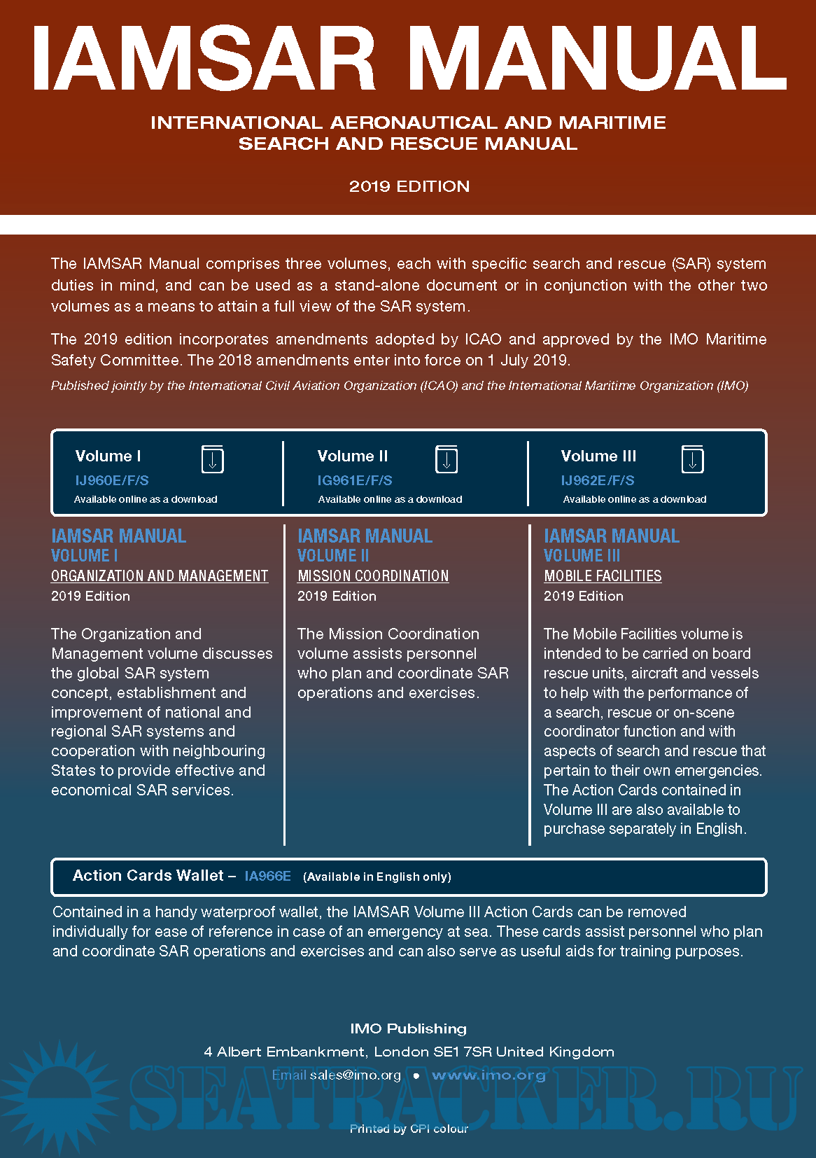 Year: 2019 Language: english Author: ICAO + IMO Genre: Manual Publisher: ICAO + IMO Edition: 2019 ISBN: 978-92-801-1699-1, 978-92-801-1700-4, 978-92-801-1701-1 Format: PDF Quality: eBook Pages count: 143, 515, 261 Description: Volume I discusses the global SAR system concept, establishment and improvement of national and regional SAR systems and cooperation with neighbouring States to provide effective and economical SAR services. Volume II assists personnel who plan and co-ordinate SAR operations and exercises. Volume III is intended to be carried aboard rescue units, aircraft and vessels to help with performance of a search, rescue or on-scene coordinator function, and with aspects of SAR that pertain to their own emergencies.