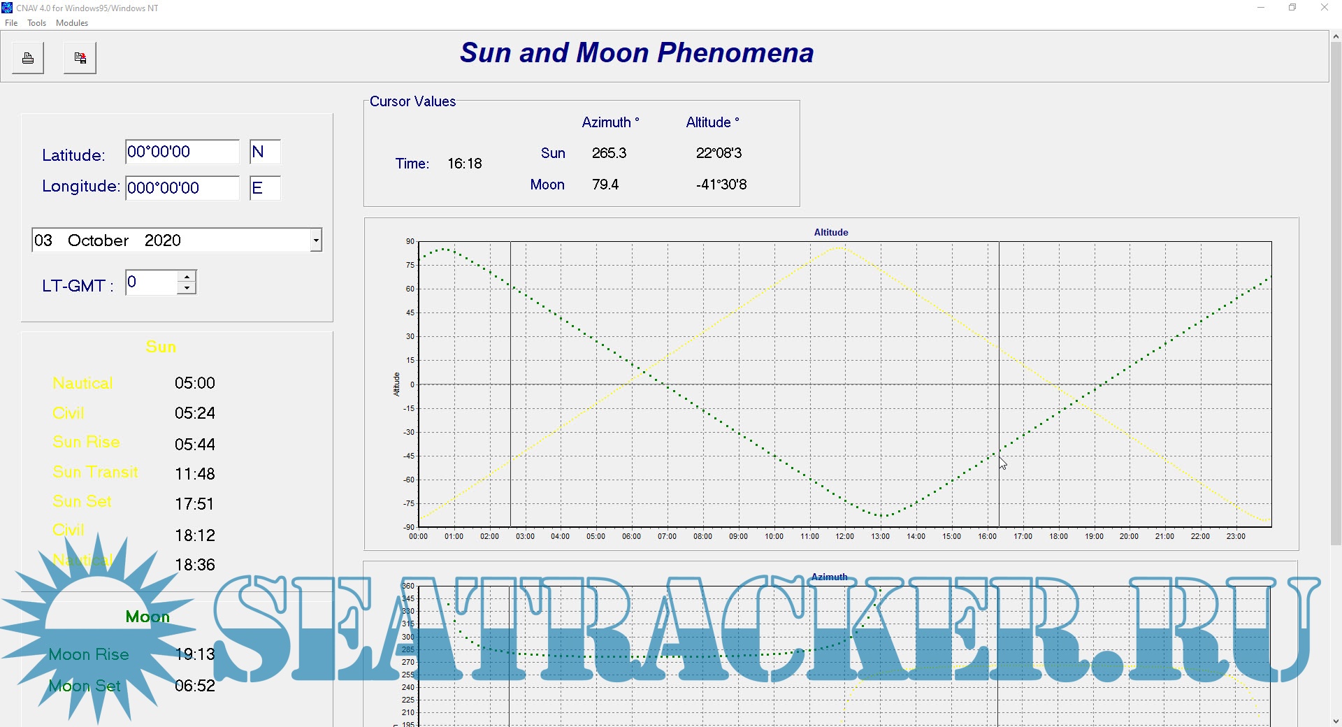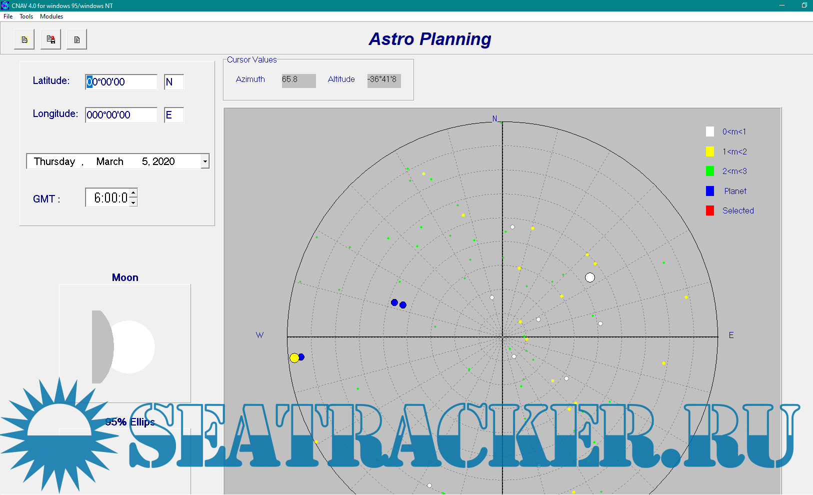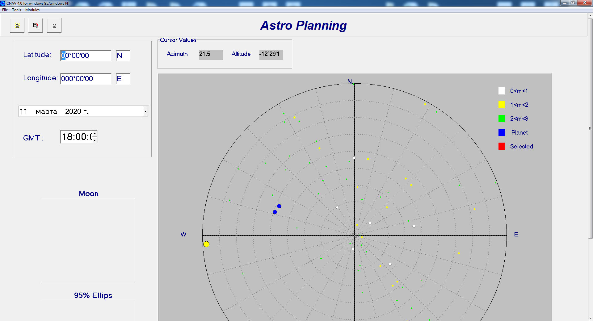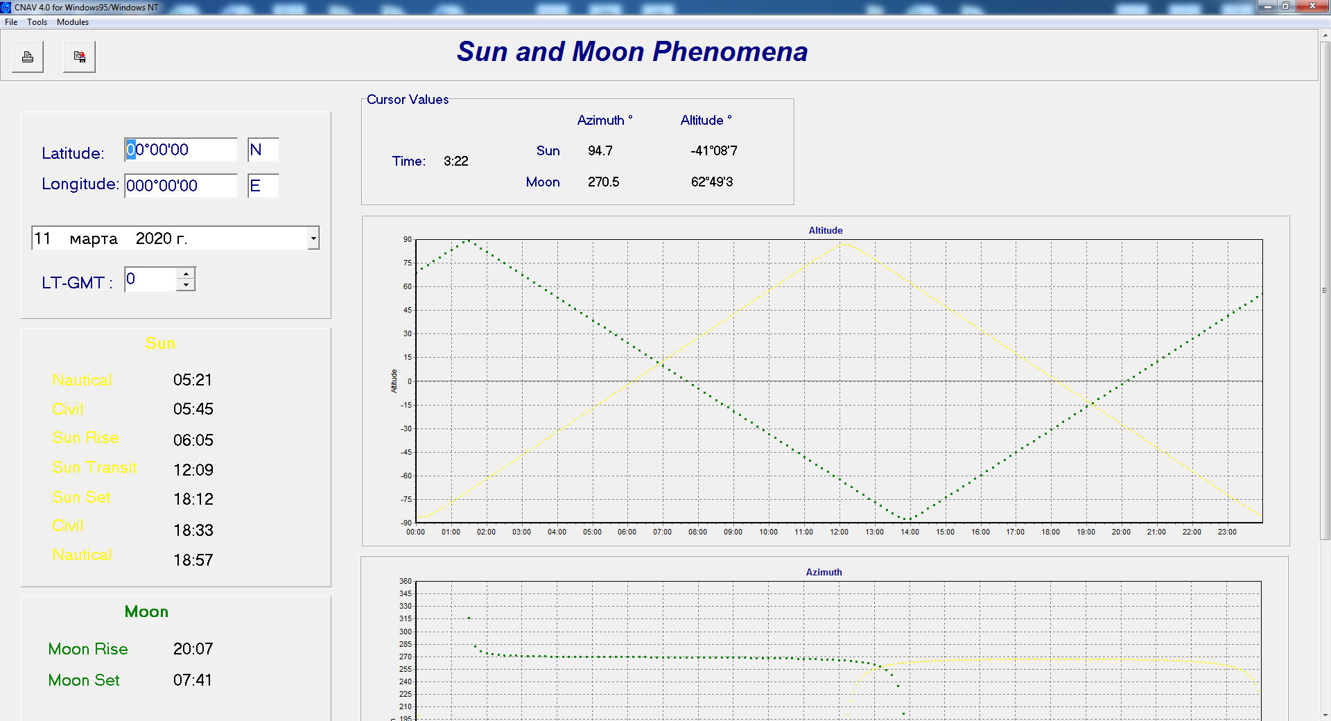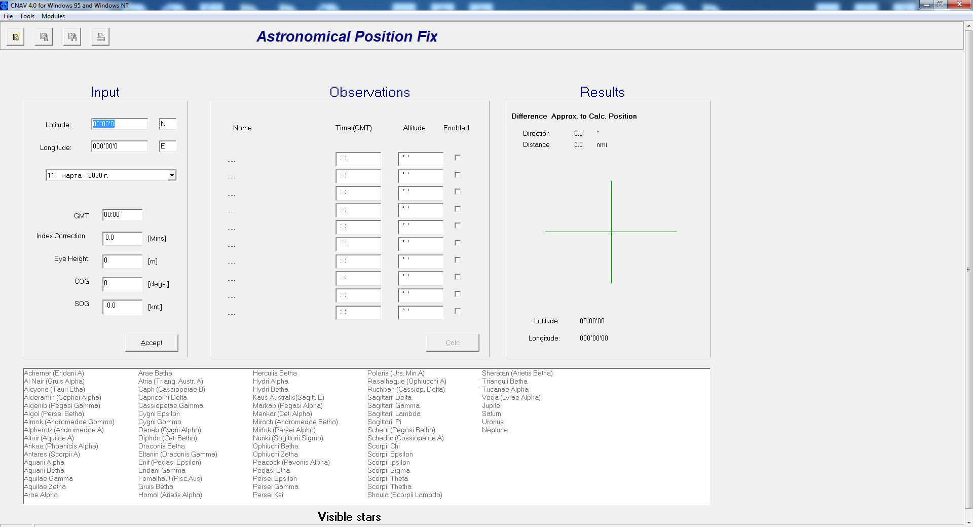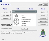 Description: CNAV 4.1 is a calculation software for Astro - Sun/Moon astro planning and position fixing, Tides and Streams, Routes and other tools. Works for every OS. CNAV 4.1 is a program which can show/calculate Sun/Moon Phenomena, Astro planning and astro position fix, Tidal height and stream calculations and etc. With CNAV 4.1, you can make quick and accurate calculations for traditional navigation. This includes calculations of course, distance, tides and celestial navigation for voyage planning and execution.