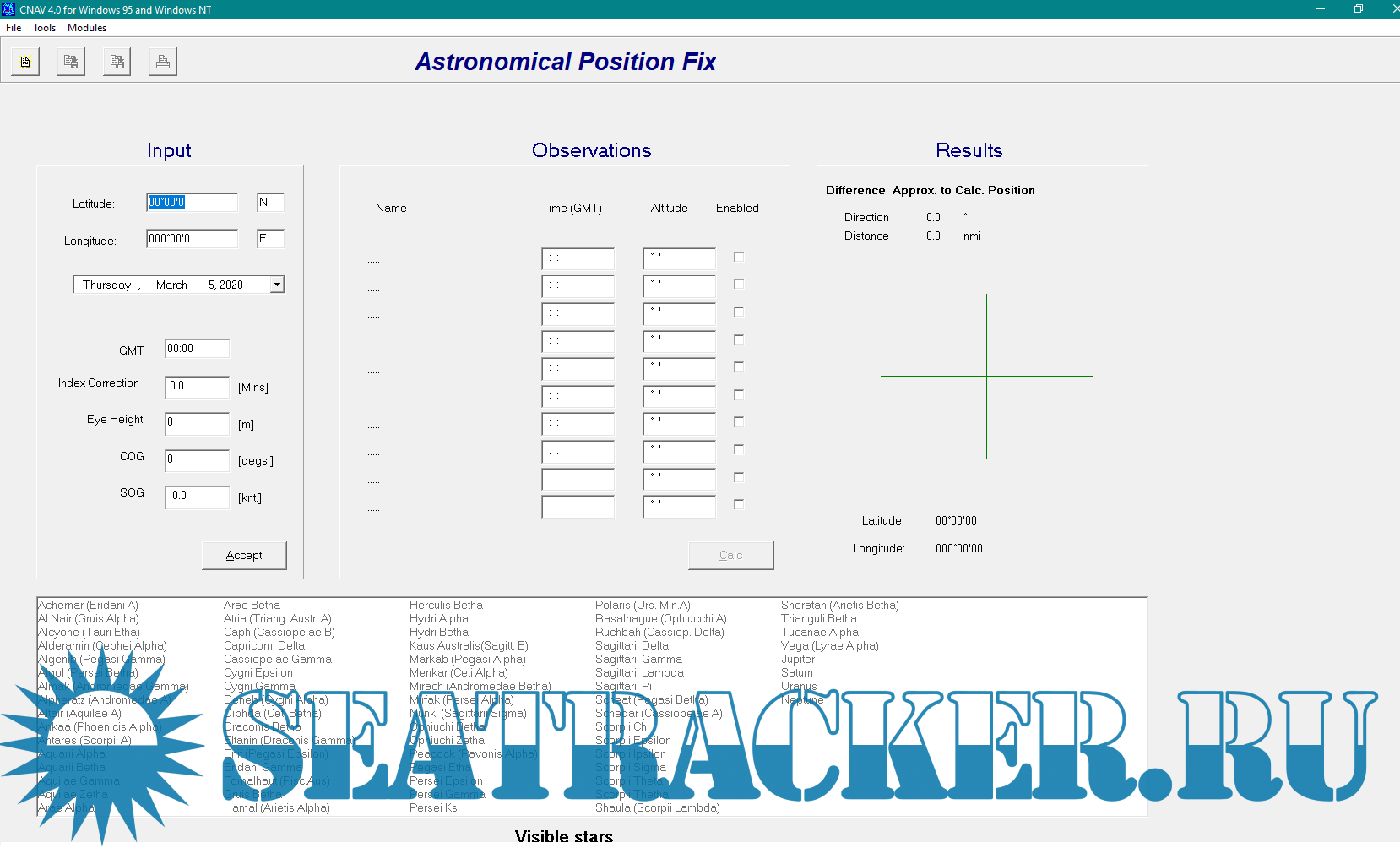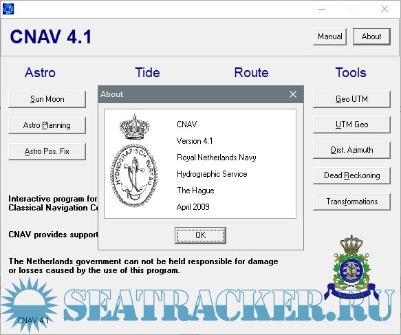 Year: 2009 Version: 4.1 Developer: Ministry Of Defense Platform: Windows System Requirements: Windows XP/7/8/10 Localization: english Crack: Not needed Description: CNAV 4.1 is a calculation software for Astro - Sun/Moon astro planning and position fixing, Tides and Streams, Routes and other tools. Works for every OS. CNAV 4.1 is a program which can show/calculate Sun/Moon Phenomena, Astro planning and astro position fix, Tidal height and stream calculations and etc. With CNAV 4.1, you can make quick and accurate calculations for traditional navigation. This includes calculations of course, distance, tides and celestial navigation for voyage planning and execution. Additional info: It is a nice and cool program to use for training. If it doesn't start downloading, PM me!