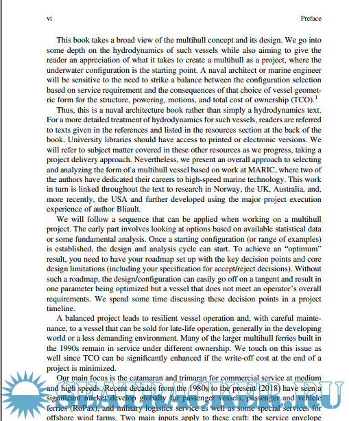 Description: This book takes a broad view of the multihull concept and its design. We go into some depth on the hydrodynamics of such vessels while also aiming to give the reader an appreciation of what it takes to create a multihull as a project, where the underwater configuration is the starting point. A naval architect or marine engineer will be sensitive to the need to strike a balance between the configuration selection based on the service requirement and the consequences of that choice of vessel geometric form for the structure, powering, motions, and total cost of ownership (TCO).1