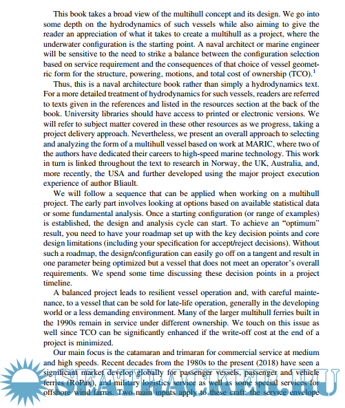 Thus, this is a naval architecture book rather than simply a hydrodynamics text. For a more detailed treatment of hydrodynamics for such vessels, readers are referred to texts given in the references and listed in the resources section at the back of the book. University libraries should have access to printed or electronic versions. We will refer to the subject matter covered in these other resources as we progress, taking a project delivery approach. Nevertheless, we present an overall approach to selecting and analyzing the form of a multihull vessel based on work at MARIC, where two of the authors have dedicated their careers to high-speed marine technology. This work, in turn, is linked throughout the text to research in Norway, the UK, Australia, and, more recently, the USA and further developed using the major project execution experience of author Bliault.