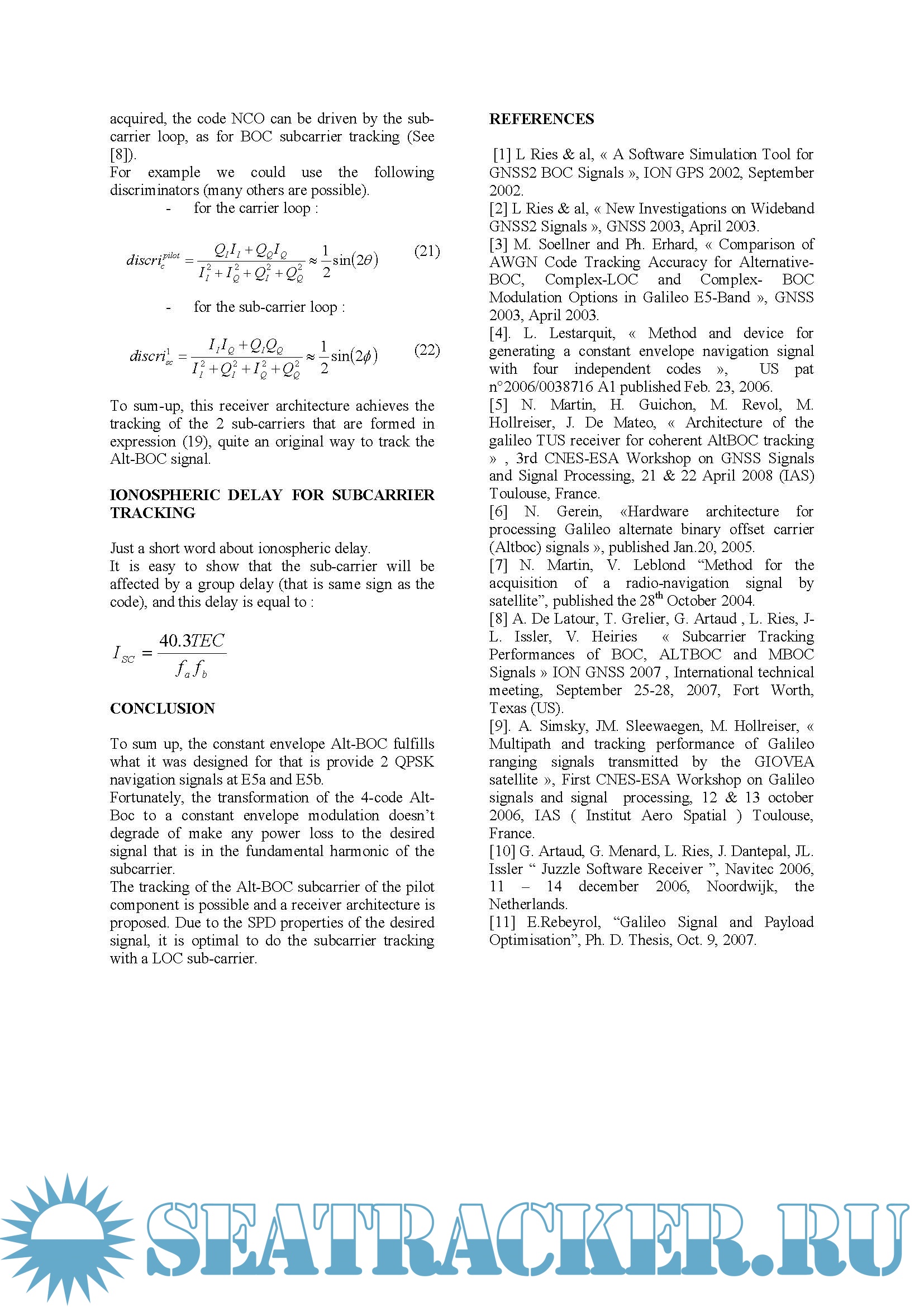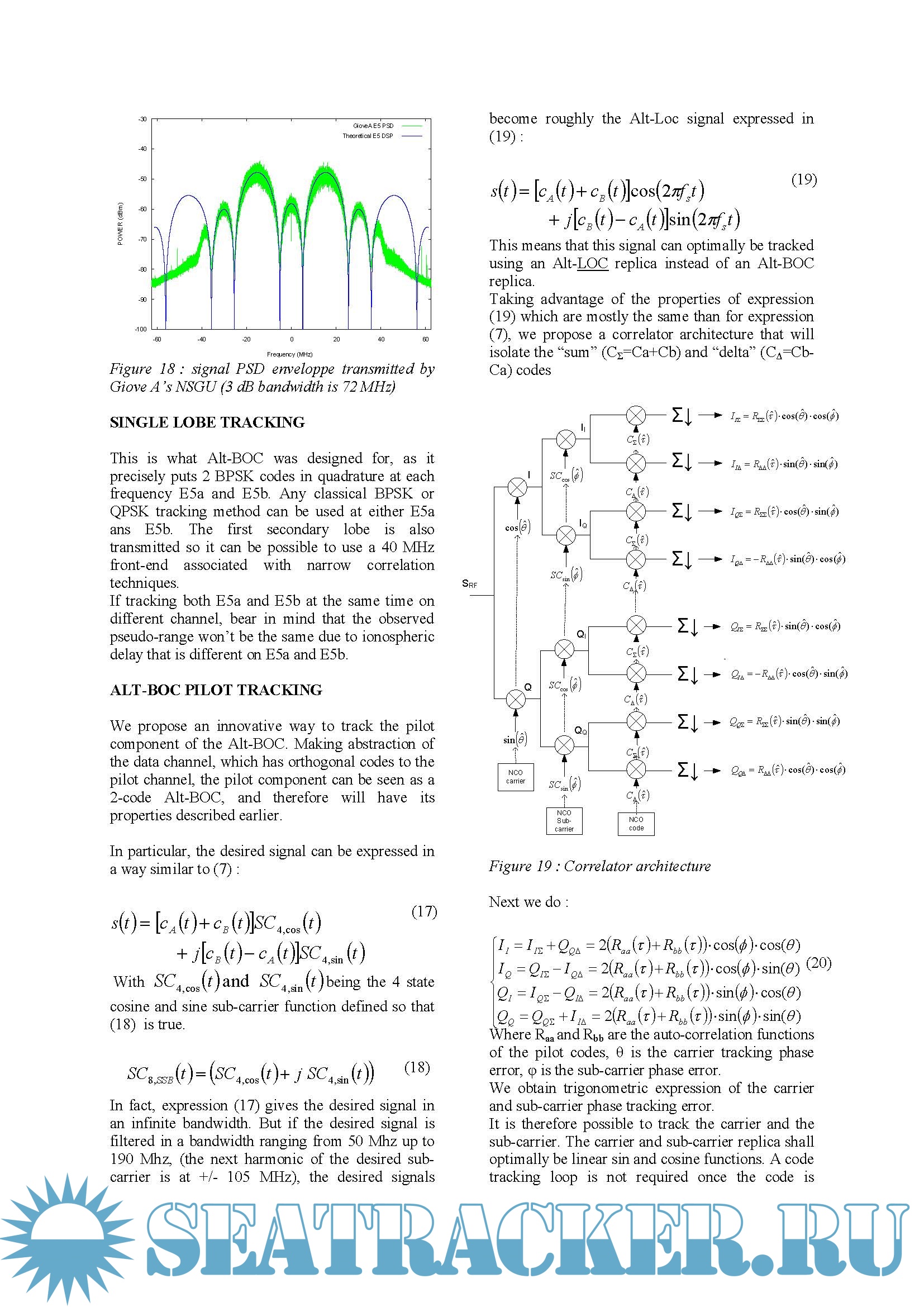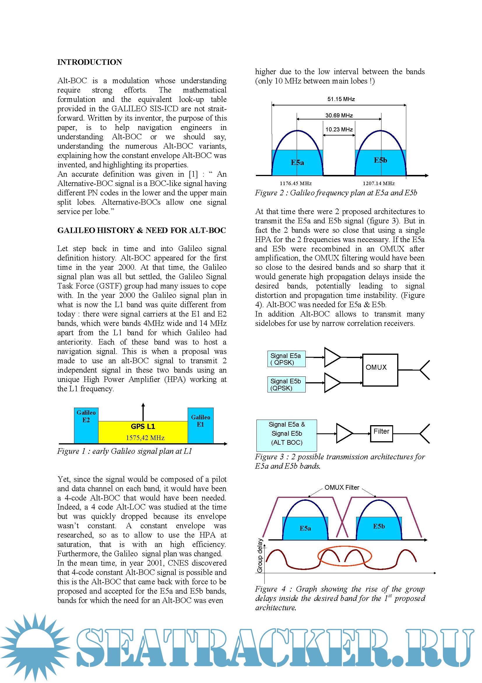 Description: Alt-BOC is a modulation whose understanding require strong efforts. The mathematical formulation and the equivalent look-up table provided in the GALILEO SIS-ICD are not strait-forward. Written by its inventor, the purpose of this paper, is to help navigation engineers in understanding Alt-BOC or we should say, understanding the numerous Alt-BOC variants, explaining how the constant envelope Alt-BOC was invented, and highlighting its properties. An accurate definition was given in : “ An Alternative-BOC signal is a BOC-like signal having different PN codes in the lower and the upper main split lobes. Alternative-BOCs allow one signal service per lobe.”