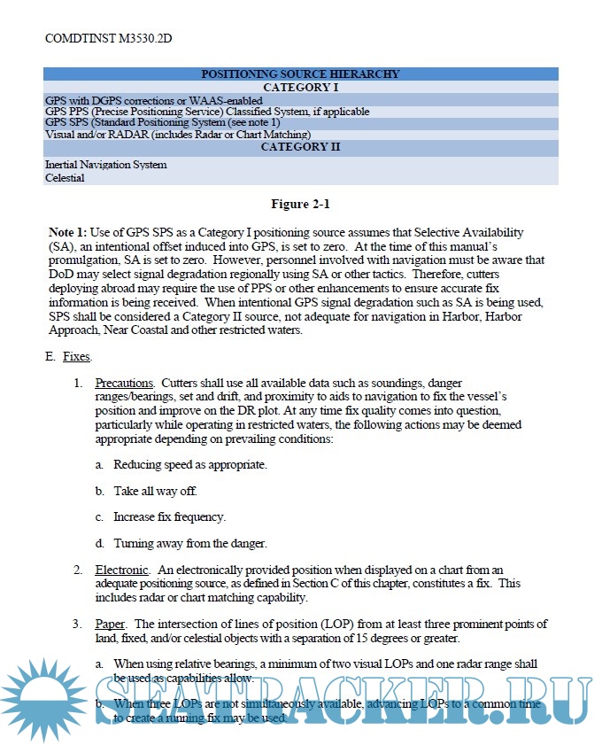 Year: 2012 Language: english Author: USCG Genre: Manual Format: PDF Quality: eBook Pages count: 76 Description: T Navigation remains a critical basis for all underway operations and a fundamental competency. This Manual promulgates navigation policies and procedures for all cutters, cutter boats and shore based boats. It is designed to assist the CO/OINC, Navigator and Coxswain in carrying out their responsibilities as outlined in Coast Guard Regulations. New updates leverage the proven reliability of internationally accepted electronic navigation systems while retaining the capability to fix position using visual lines of position and radar ranges. Additional info: USCG - Navigation Standards Manual - COMDTINST M3530.2D