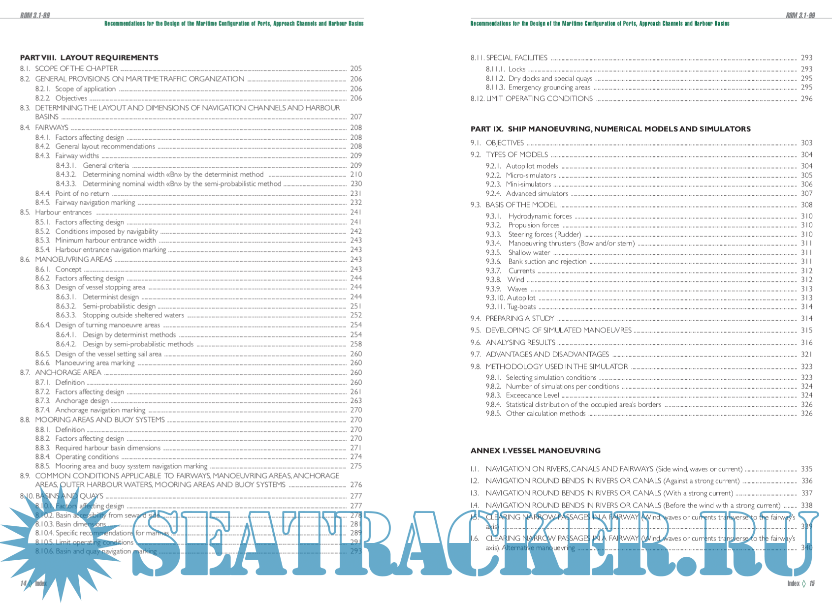 With this in mind, the main purpose of this ROM 3.1-99 is to design and build the maritime configuration of ports, their approache channels and harbour basins.Whilst not constituting a Regulation for Maritime Operation of these areas, the ROM 3.1-99 may easily be applied to this end, taking into account the fact that the maritime configuration of ports has to guarantee the limit operating conditions to be established for different vessel manoeuvring in port waters.