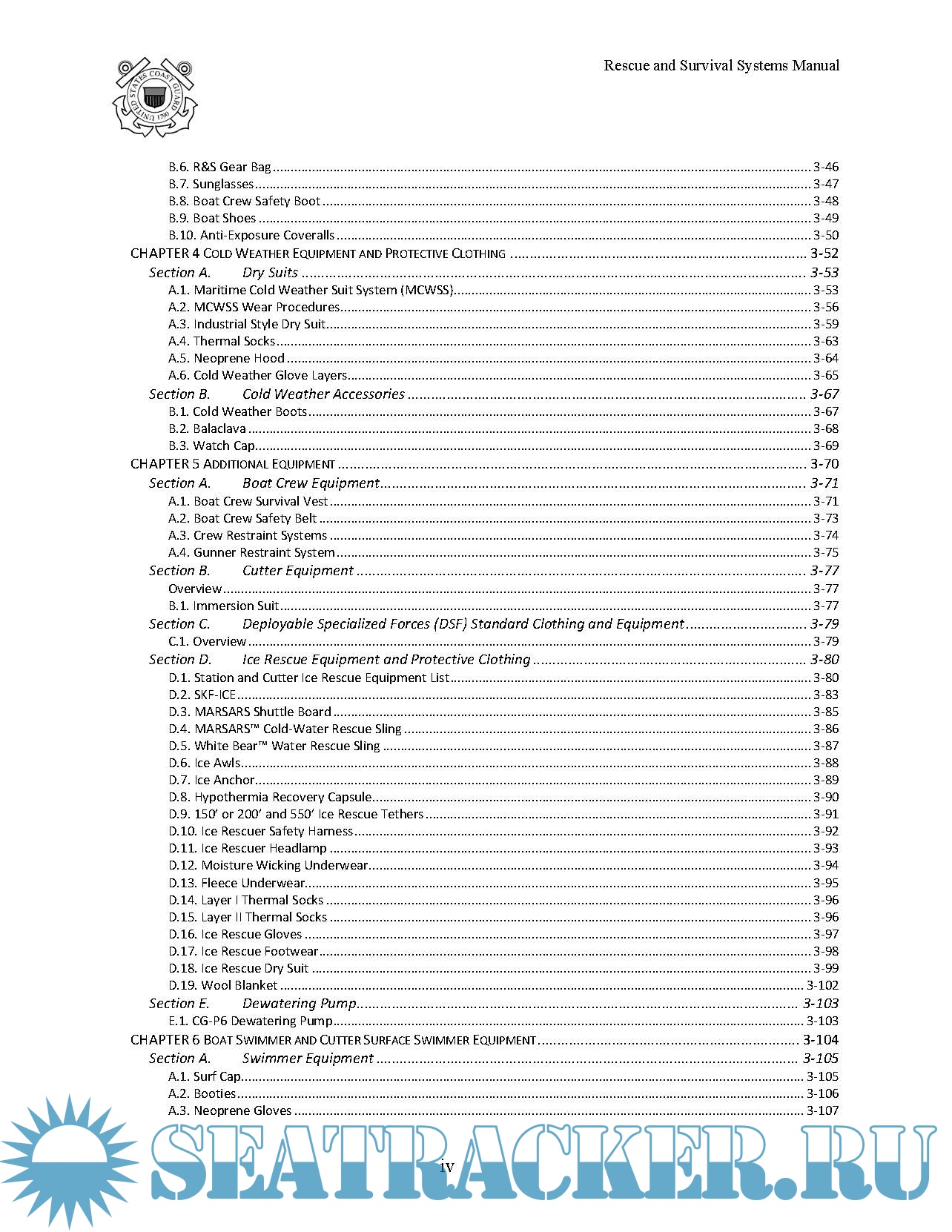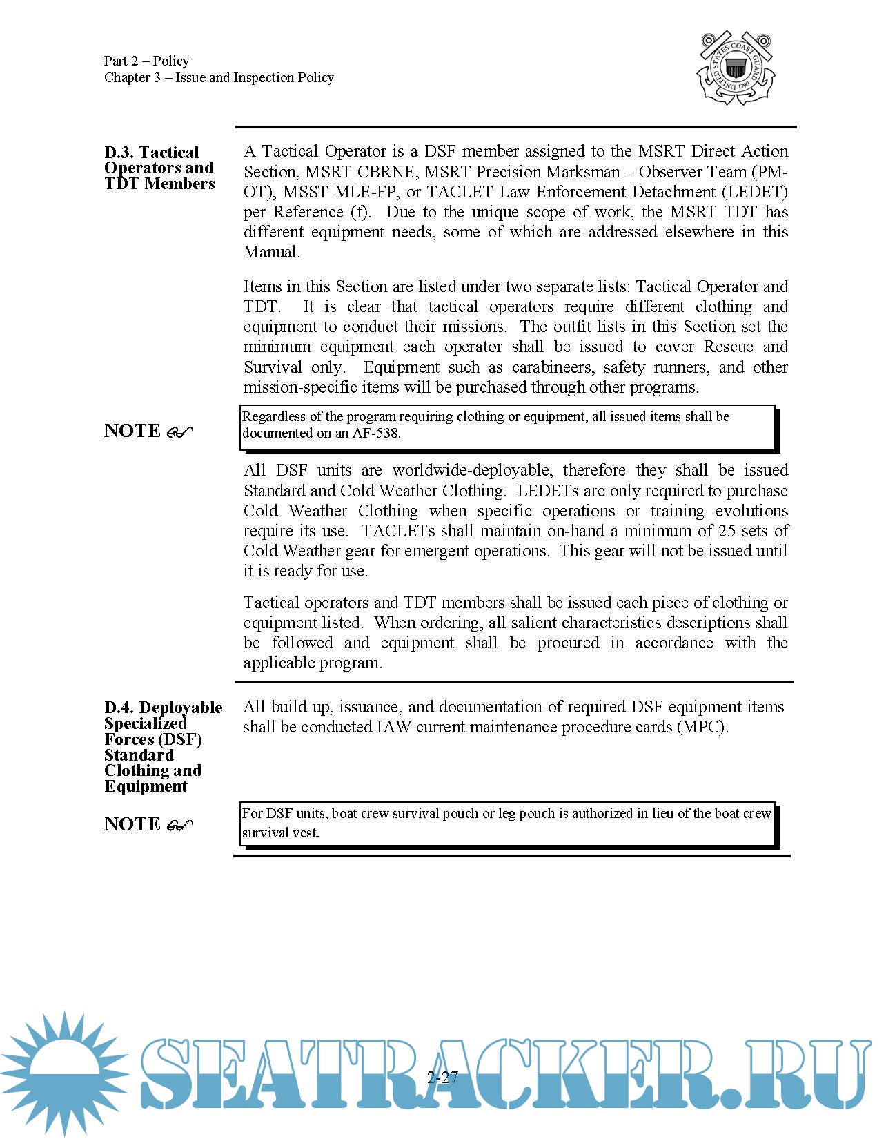 Description: This Manual establishes policy, equipment standards, procedures and procurement authorization for the use, configuration, maintenance and logistics of rescue and survival equipment used by United States Coast Guard personnel operating on or near the water.