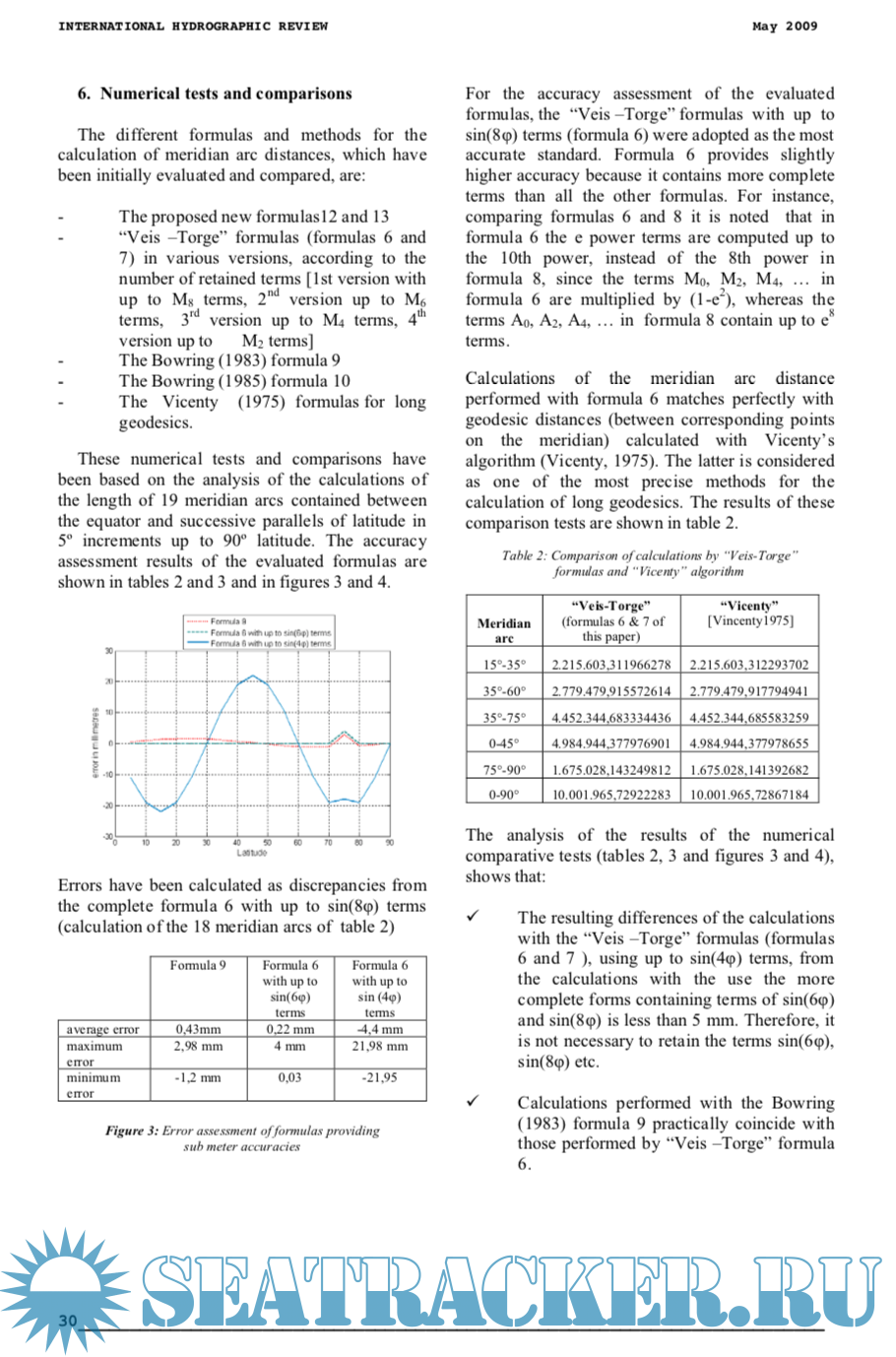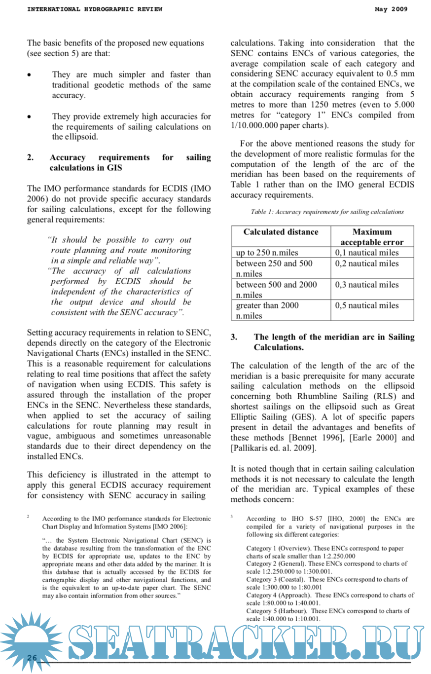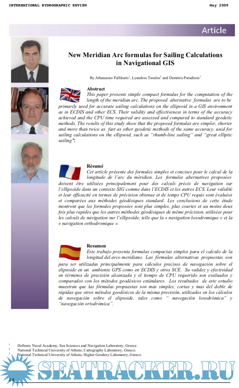 Year: 2009 Language: english Author: Athanasios Pallikaris et alli Genre: Research papers Publisher: International Hidrographic Review Format: PDF Quality: eBook Pages count: 11 Description: This paper presents simple compact formulas for the computation of the length of the meridian arc. The proposed alternative formulas are to be primarily used for accurate sailing calculations on the ellipsoid in a GIS environment as in ECDIS and other ECS. Their validity and effectiveness in terms of the accuracy achieved and the CPU time required are assessed and compared to standard geodetic methods. The results of this study show that the proposed formulas are simpler, shorter and more than twice as fast as other geodetic methods of the same accuracy, used for sailing calculations on the ellipsoid, such as “rhumb-line sailing” and “great elliptic sailing”.