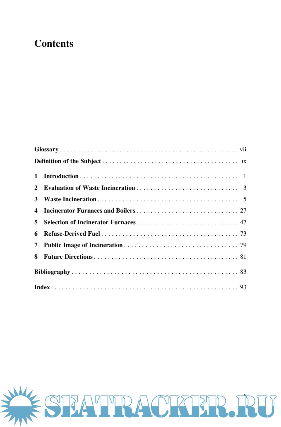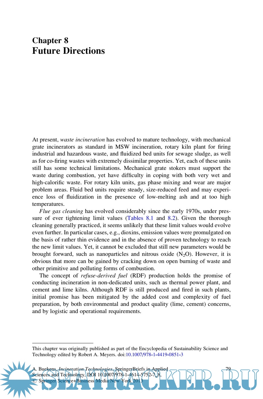 Year: 2013 Language: english Author: Buekens A. Genre: Technical book Publisher: Springer ISBN: 978-1-4614-5752-7 Format: PDF Quality: Scanned pages Pages count: 89 Description: Waste incineration is the art of completely combusting waste, while maintaining or reducing emission levels below current emission standards. Where possible, objectives include the recovering of energy as well as the combustion residues. Successful waste incineration makes it possible to achieve a deep reduction in waste volume, obtain a compact and sterile residue, and eliminate a wide array of pollutants. This book places waste incineration within the wider context of waste management, and demonstrates that, in contrast to landfills and composting, waste incineration can eliminate objectionable and hazardous properties such as flammability and toxicity, result in a significant reduction in volume, and destroy gaseous and liquid waste streams leaving little or no residues beyond those linked to flue gas neutralization and treatment. Moreover, waste incineration sterilizes and destroys putrescible matter, and produces usable heat. Incineration Technologies first appeared as a peer-reviewed contribution to the Encyclopedia of Sustainability Science and Technology. It provides detailed treatment of the challenges of this technically complex process, which requires huge investment and operating costs, as well as good technical skills in maintenance and plant operation. Particular attention is paid to technologies for ensuring the complete burn-out of flue gas and residues and for controlling the resulting pollutants.