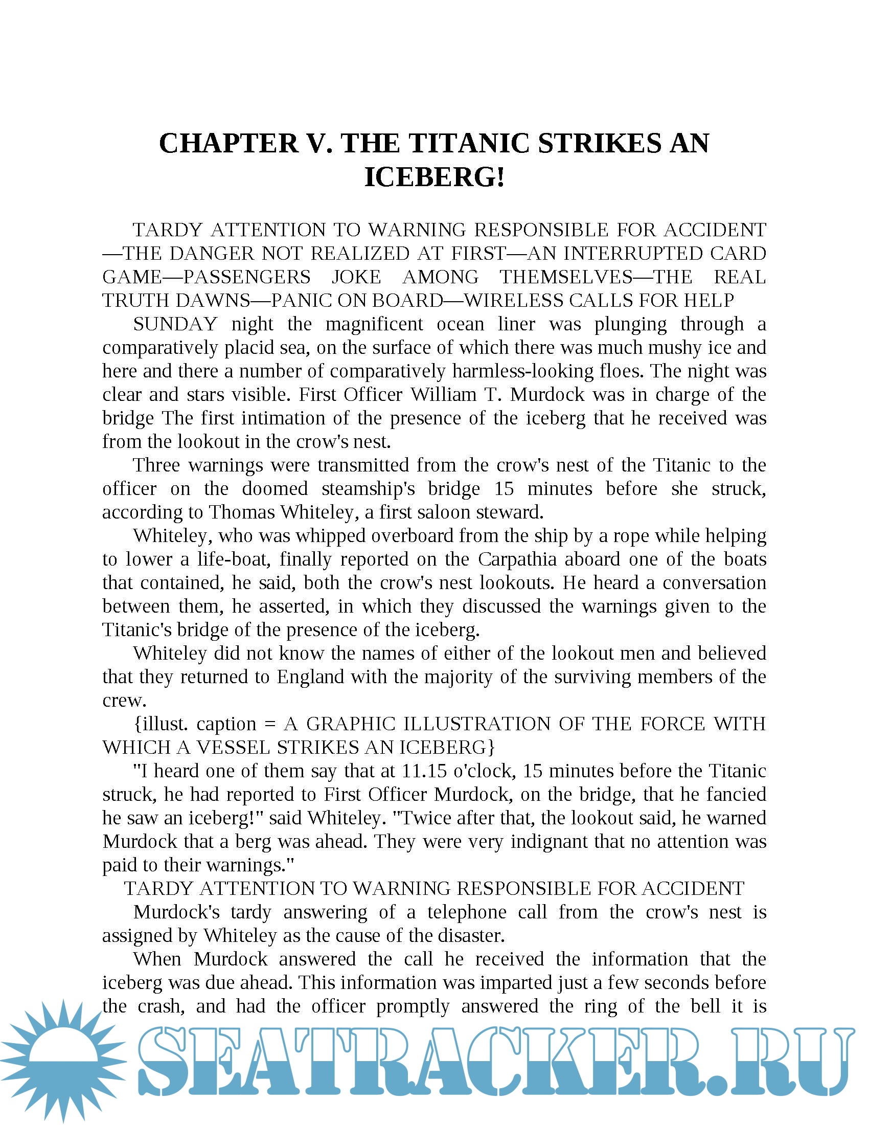 Description: A Detailed and Accurate Account of the most awful marine disaster in History, constructed from the real facts as obtained from those on board who survived. The RMS Titanic was an Olympic-class passenger liner owned by British shipping company White Star Line and built at the Harland and Wolff shipyard in Belfast, United Kingdom. For her time, she was the largest passenger steamship in the world. On the night of 14 April 1912, during the ship's maiden voyage, Titanic hit an iceberg and sank two hours and forty minutes later, early on 15 April 1912. The sinking resulted in the deaths of 1,517 people, making it one of the most deadly peacetime maritime disasters in history. The high casualty rate was due in part to the fact that, although complying with the regulations of the time, the ship did not carry enough lifeboats for everyone aboard. A disproportionate number of men died due to the women-and-children-first protocol that was followed.