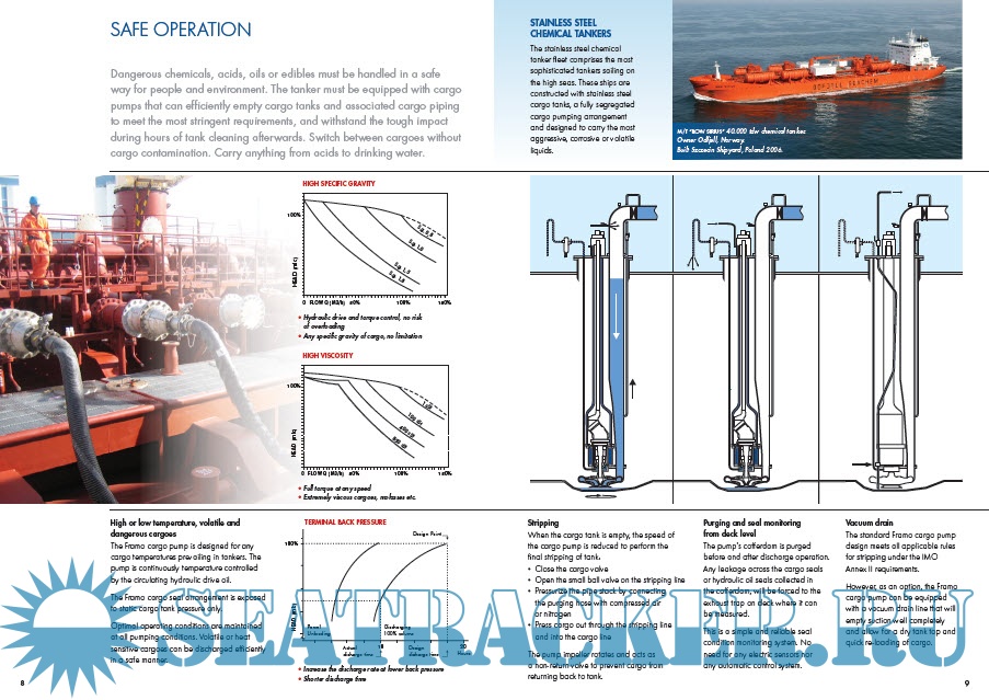 Year: 2019 Language: english Author: Framo Genre: Reference book Format: PDF Quality: Unknown Pages count: 17 Description: Dangerous chemicals, acids, oils or edibles must be handled in a safe way for people and environment. The Framo cargo pump is of a robust construction made to efficiently empty any cargo tank containing the most heavy, viscous or aggressive cargoes. The hydraulic driveline is designed for a safe and reliable pumping and final stripping of the most volatile or dangerous cargoes carried in bulk. No risks of any build up of heat due to a fail-safe design where the pump motor and bearings are constantly lubricated and cooled by the hydraulic oil driving medium.