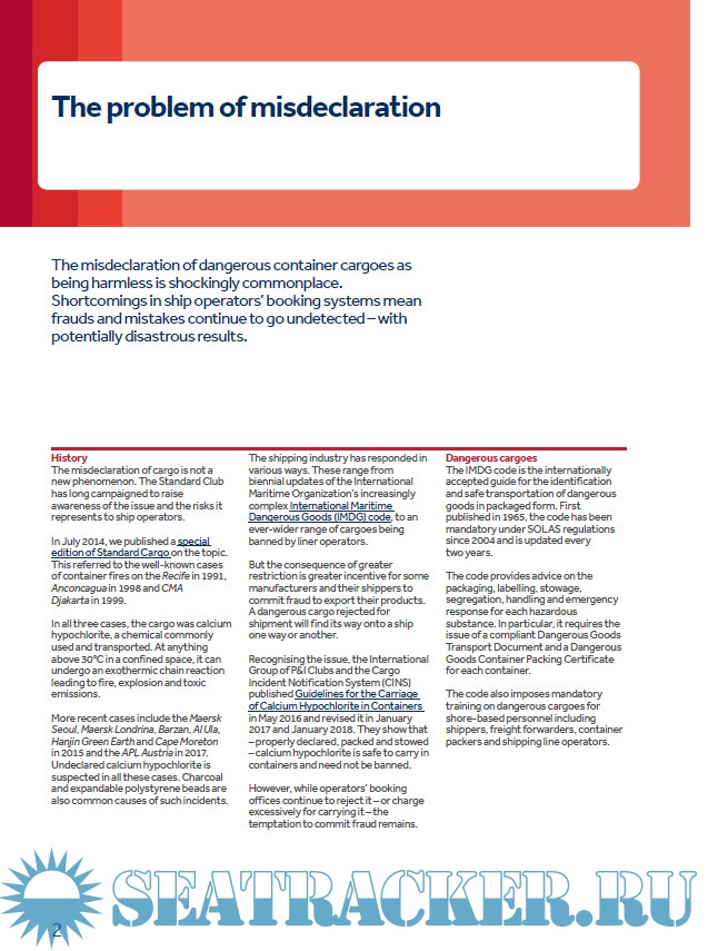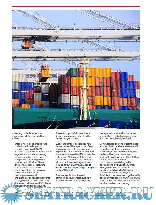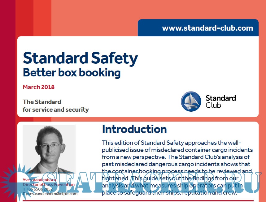 Year: 2018 Language: english Author: The Standard Club Genre: Other Format: PDF Quality: Unknown Pages count: 11 Description: This edition of Standard Safety approaches the issue of misdeclared container cargo incidents from a new perspective. The Standard Club’s analysis of past misdeclared dangerous cargo incidents shows that the container booking process needs to be reviewed and tightened. This guide sets out the findings from our analysis and what measures ship operators can put in place to safeguard their ships, reputation and crew.