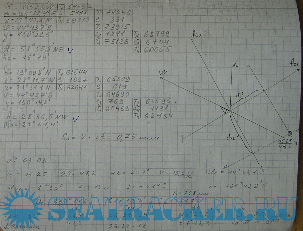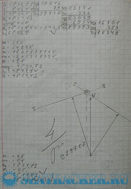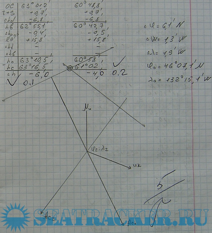 Решённые карточки по двум звёздам и разновремённым наблюдениям Солнца. Также содержится небольшое количество ответов для карточек по определению поправки компаса.