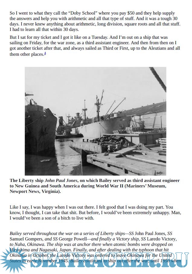 Year: 2014 Language: english Author: Gillen, Michael Genre: History Publisher: Mc Farland & Company, Inc. Edition: First ISBN: 978-1-4766-1887-6 Format: PDF Quality: eBook Pages count: 235 Description: As per the author, “this is an oral history of the U.S. Merchant Marine in World War II and, as such, most of what you will read here will be taken directly from transcripts of the voices of the seamen themselves on tape. To retain authenticity little has been changed, except where, to reduce confusion, a word or two has been added [in brackets]. Also, to reduce repetition, words have been cut in certain instances. But the “color” of the language has been retained, whether that be a certain regional inflection, or usage of an occasional indelicate expression at which some merchant seamen are known to be particularly skilled.”.