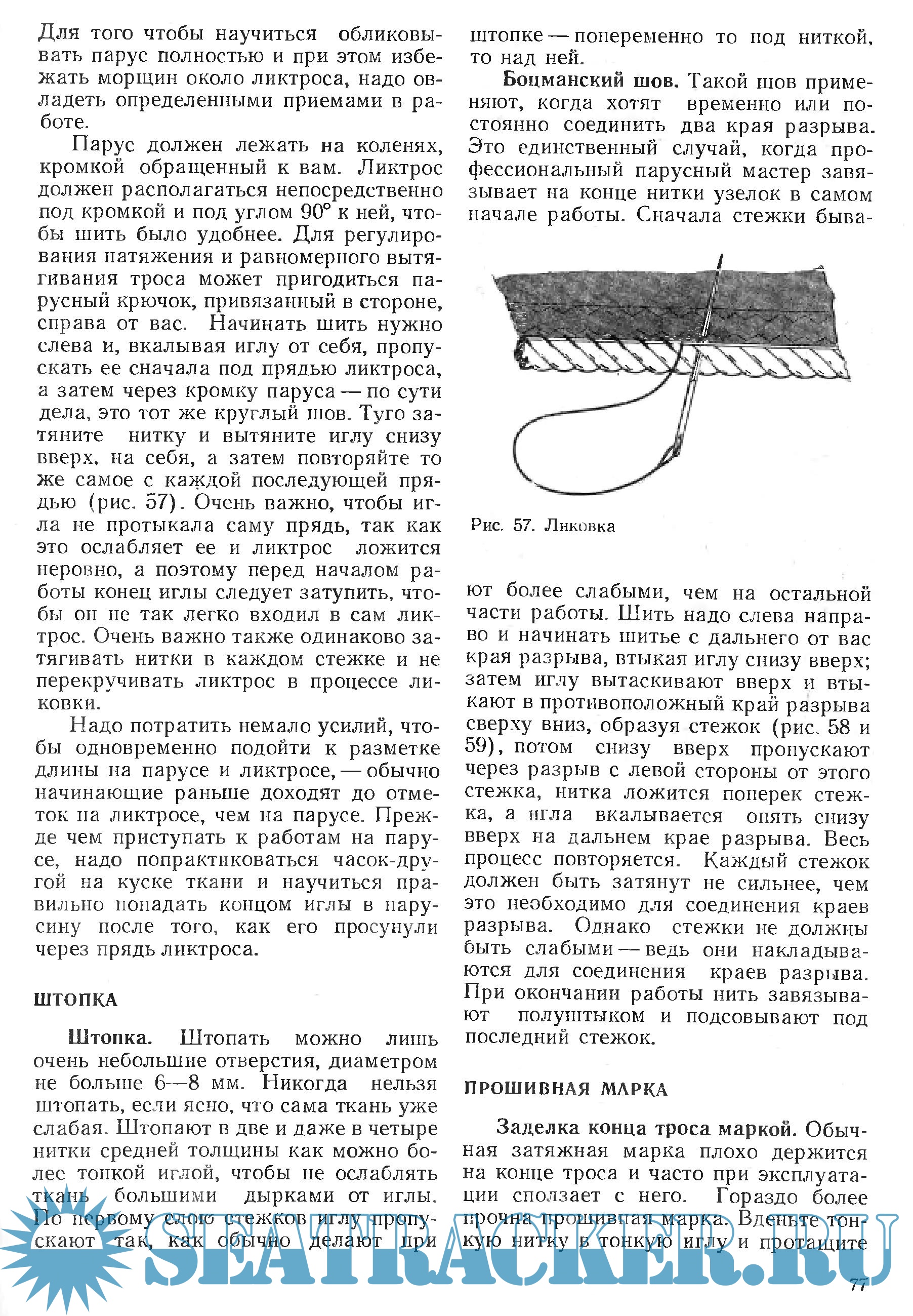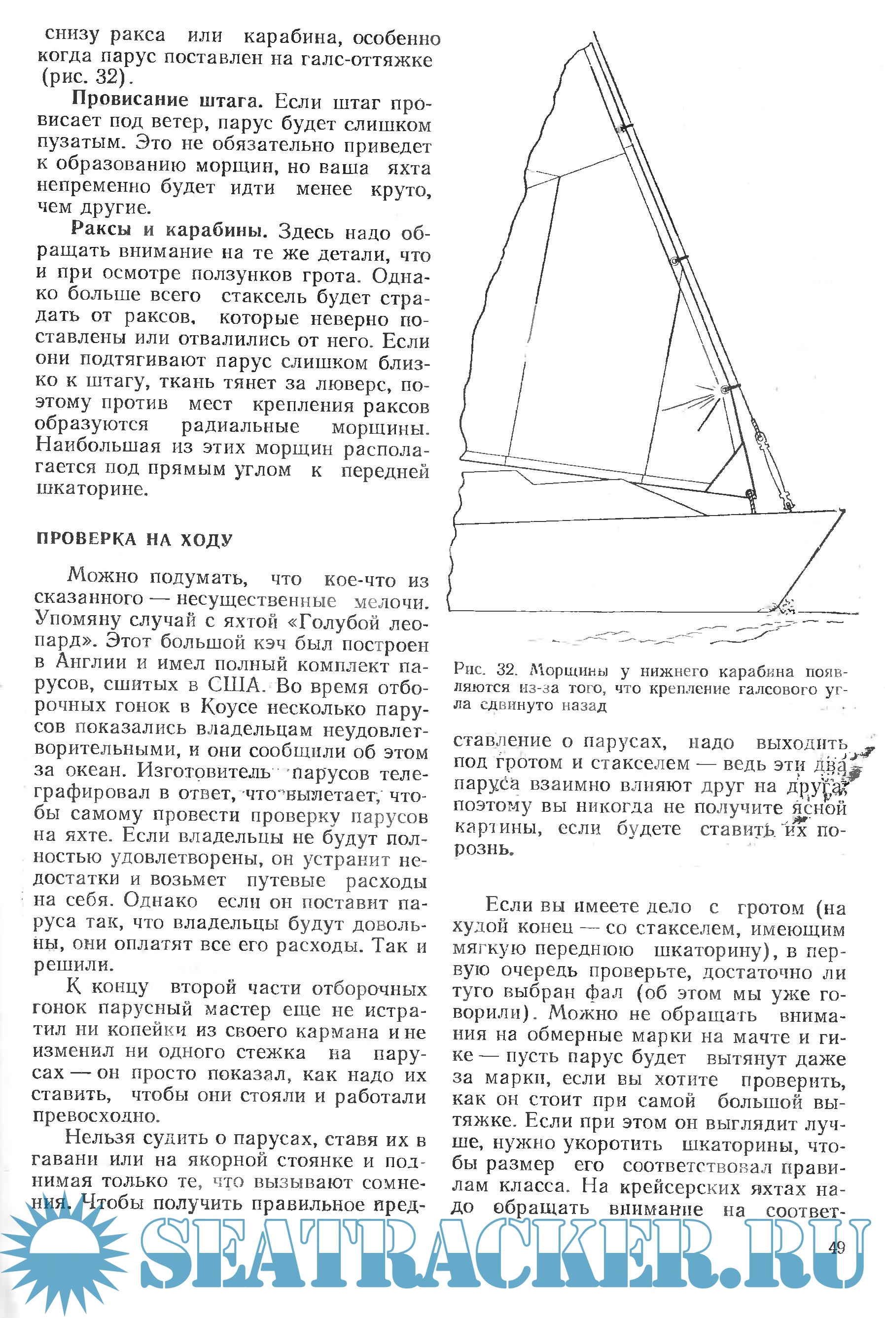 Описание: Знаете ли вы, как ухаживать за парусами, как перекроить и подогнать их, как починить? Загляните в книгу известного английского специалиста по парусному спорту, она поможет решить вам все эти проблемы. И даже если многое из того, что пишет автор, известно вам, вы все же найдете для себя полезное и поучительное. Книга эта - своеобразный справочник яхтсмена и адресуется яхтсменам различной квалификации.