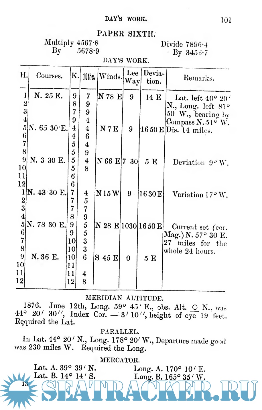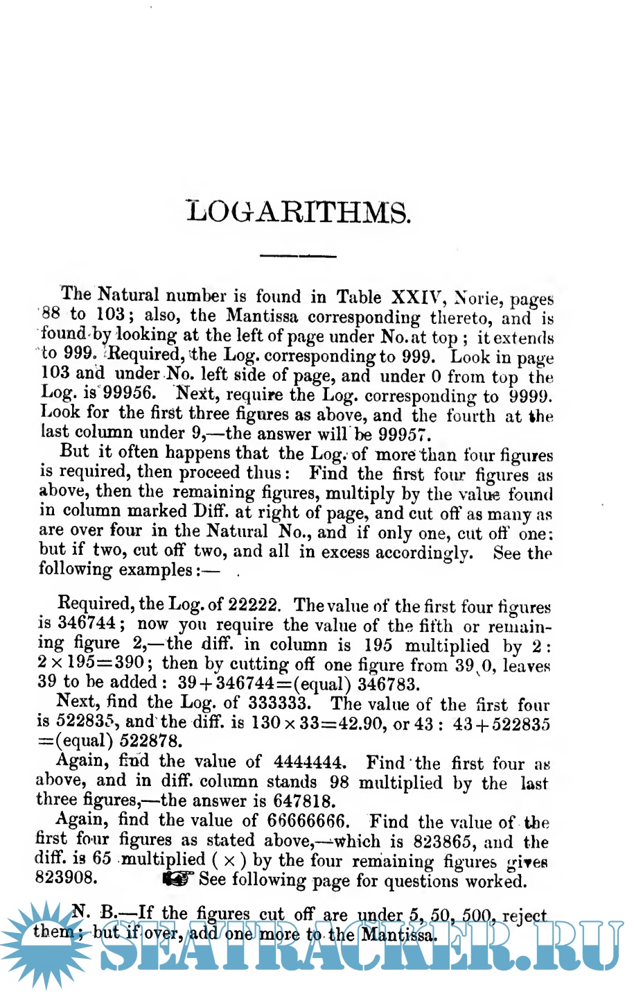 Mariner, I have begun at the beginning, and explained the Tables to be used, the method of using them, with the numbers of the pages, and several examples for correcting seconds and tenths. My reason for so doing is, that in my experience as teacher, I have known pupils to have been kept days seeking for the Tables and explanations, not knowing how to use them at sea, having had no one to instruct them. This work will prove a valuable guide for them previous to attending the school to prepare for examination.