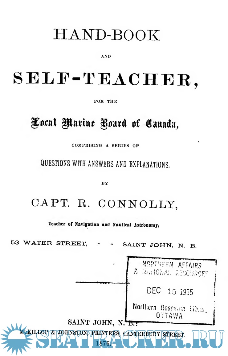 Year: 1876 Language: english Author: Capt. R. Connolly Genre: Handbook Publisher: McKillop & Johnston Format: PDF Quality: Scanned pages Pages count: 142 Description: Hand-book and self-teacher for the local Marine Board of Canada comprising a series of questions with answers and explanations. In preparing this Self-Teacher for the young and iuexperienced Mariner, I have begun at the beginning, and explained the Tables to be used, the method of using them, with the numbers of the pages, and several examples for correcting seconds and tenths. My reason for so doing is, that in my experience as teacher, I have known pupils to have been kept days seeking for the Tables and explanations, not knowing how to use them at sea, having had no one to instruct them. This work will prove a valuable guide for them previous to attending the school to prepare for examination. In conclusion, the young Navigator will find on perusing this little book, that I have left no stone unturned to make all that is necessary for passing an examination as simple as possible, and that he will find pleasure and benefit in the perusal ot its pages, whether he is at sea, and when at anchor, or lying in harbor.