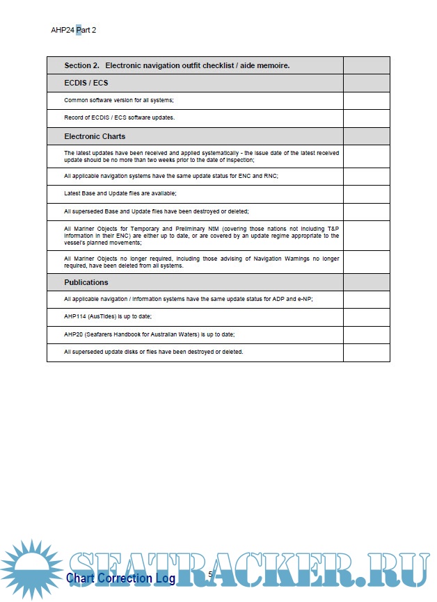 Year: 2017 Language: english Author: Commonwealth of Australia Genre: Practical guide Format: PDF Quality: eBook Pages count: 30 Description: This publication accompanies AHP24. This simplified Chart Correction Log is focussed on: ENC - tracking Base disks and Update disks, and their application across up to five systems within each vessel Paper charts and publications – tracking and application of Notices to Mariners.
