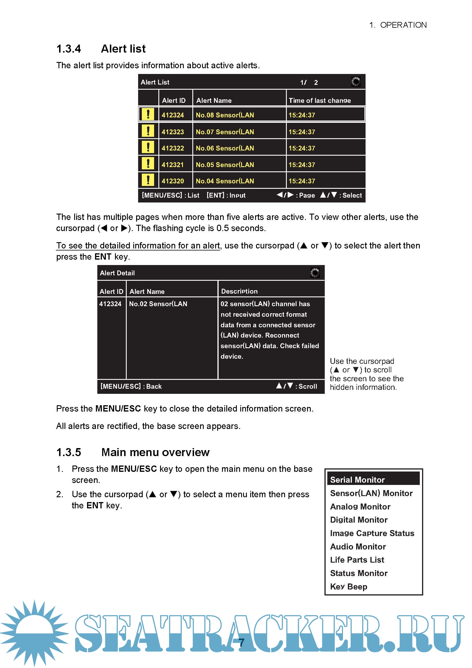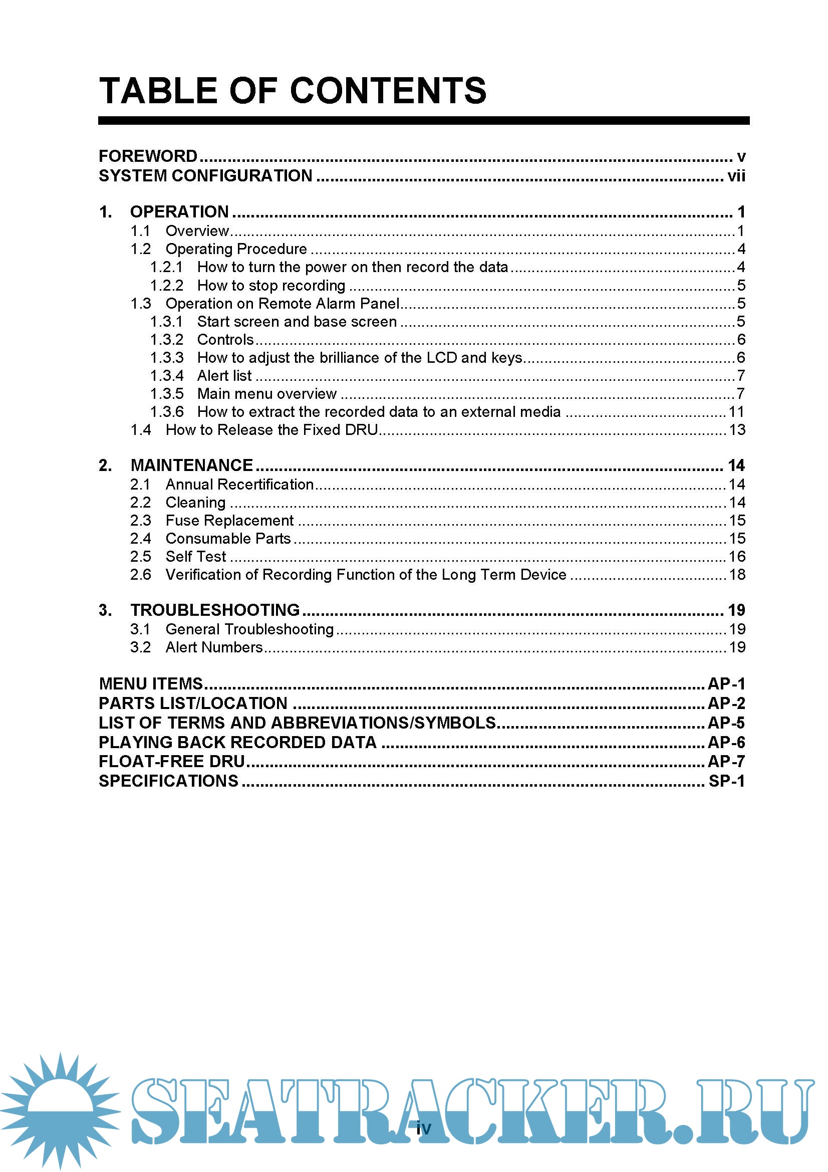 Year: 2014 Language: english Author: Furuno Genre: Manual Format: PDF Quality: eBook Pages count: 48 Description: A VDR records various data and events encountered aboard ship. The purpose of the VDR is to help investigators locate the causes of marine incidents. The revised SOLAS Chapter V requires the installation of VDRs on passenger ships of 150 GT and above on all voyages and other ships of 3000 GT and above on international voyages and for newly built ships on and after 1 July, 2002. The basic VR-7000 consists of a Data Collecting Unit (DCU), a Data Recording Unit (DRU), a Remote Alarm Panel (RAP), a video LAN converter, a sensor adapter and microphones to record bridge audio. A Junction Box (JB) is optional. The DCU contains the Data Processor Unit, interface modules and backup batteries. It collects data from sensors as required by the IMO and IEC standards. The DCU processes the incoming data and information in the order of occurrence while old data is overwritten with new data for storage in the DRU for 48 hours. The batteries supply power to the DCU to record bridge audio for two hours in case of a ship’s mains power failure. The flash memory in the DRU stores the data coming from the DCU. All essential navigation and status data including bridge conversation, VHF communications, and radar images are recorded. The data can be retrieved by using playback software for investigation after an incident. The Fixed DRU components are embodied in a protective capsule. The capsule ensures survival and recovery of the recorded data after an incident. An acoustical pinger helps locate the Fixed DRU underwater. The Float-free DRU components are embodied in the bracket. When the Float-free DRU sinks to depths of up to four meters, the capsule automatically comes off from the bracket then floats on the sea surface. A signal helps locate the Float-free DRU.