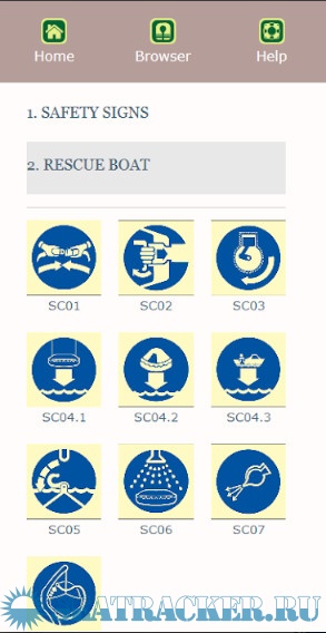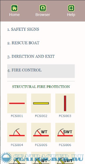 The browser section gives detailed information in 3 languages (EN, FR and GER) on 6 categories of signs: IMO Safety Signs, IMO Rescue Boat Launch Signs, IMO Direction and Exit Signs, IMO Fire Control Signs, ISO Personal Safety Signs and as a bonus the UN Global Harmonized System for Hazardous Goods.