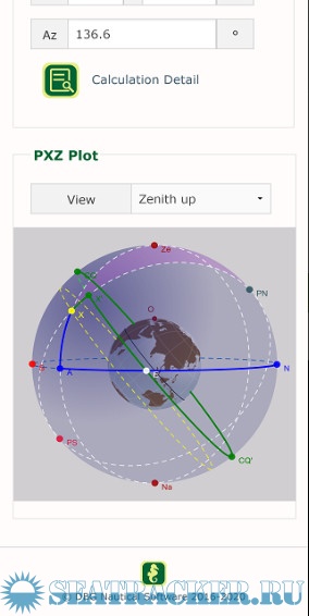 The Celestial Calculator determines the geocentric and topocentric coordinates of any celestial body for a given date and position. Consult our help page for a complete description of input fields and output symbols. In this calculator we also show a PXZ plot, where you can choose Pole Up or Zenith Up orientation. All this to give you more insight. In the tab Calculation Detail we show all details of the calculations according to different methods: Cosine, Haversine, Versine, ABC. This allows you to check your manual calculations and searches in the Nautical Almanac, helping you to master Astro navigation.