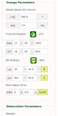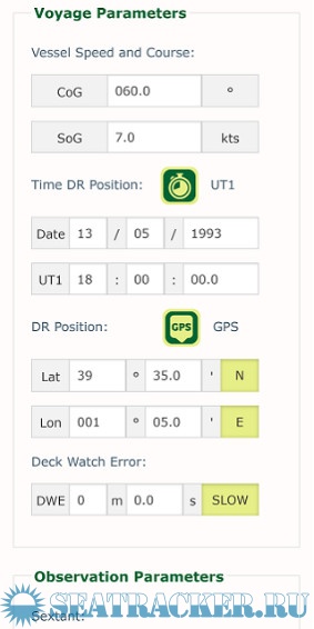 In the Parameters tab you enter the course and speed of the ship, and the last known dead reckoning (DR) position and time. You can save them all. More parameters such as deck watch error, sextant index error and observation altitude are possible.