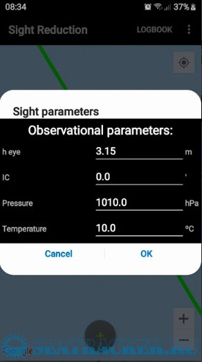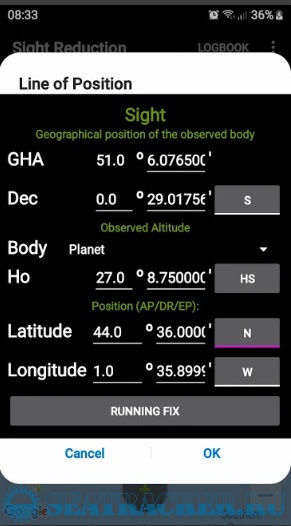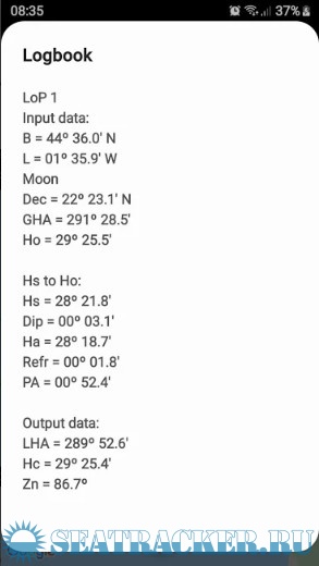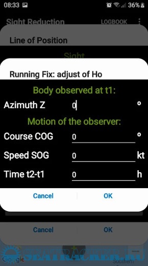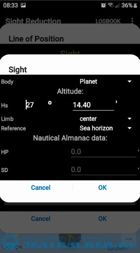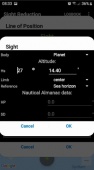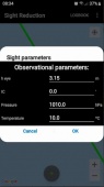 - Input for observed altitude Ho or instrumental Hs (Nautical Almanac data needed for the Sun and the Moon)