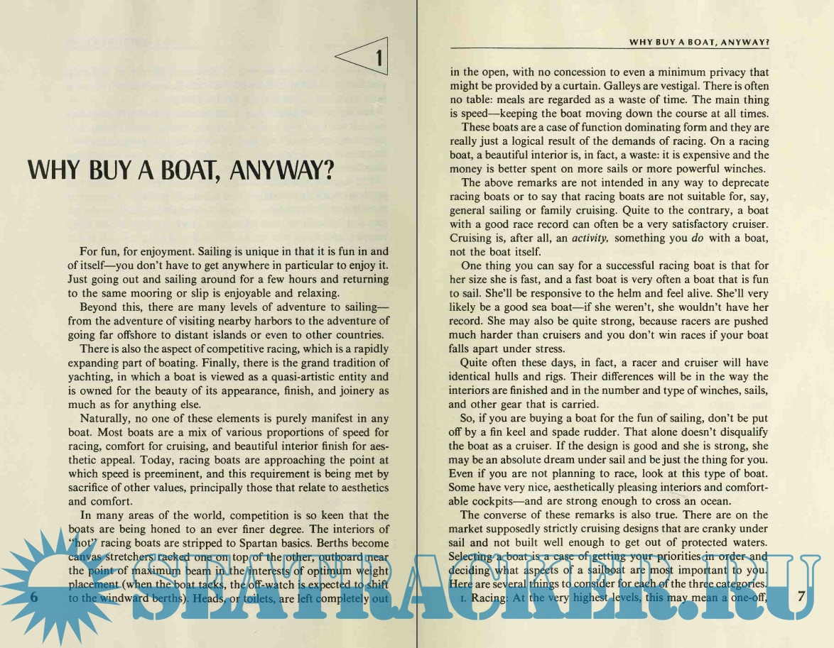 Year: 1985 Language: english Author: Hewitt Schlereth Genre: Handbook Publisher: W.W. Norton & Company Edition: First ISBN: 0-3 cJ3-033Q0-7 Format: PDF Quality: Scanned pages Pages count: 242 Description: Drawing on fifteen years in the boat business as, successively, broker, yard manager, magazine editor, and surveyor, Hewitt Schlereth presents a comparative method for evaluating boats that requires virtually no prior knowledge on the part of the would-be purchaser. He simply teaches what to look at and then shows how to let your own common sense and judgment take over. Written in a lucid, conversational style, the book is more than a how-to handbook. It is sprinkled with wry observations about boating and the boat business; it forthrightly addresses such human issues as how to select and deal with, first, a broker, and then a marine surveyor. Since the author believes boats are for fun, the tone of the book is light, avoiding the tendency of many experts to speak of flaws in terms of high dudgeon or moral outrage. Indeed, one potentially somber moment-the inspection of a truly doggy boat-produces a sample survey report of genuine hilarity. In all, this is a thoroughgoing book by an expert who addresses himself to the real concerns of boat buyers.