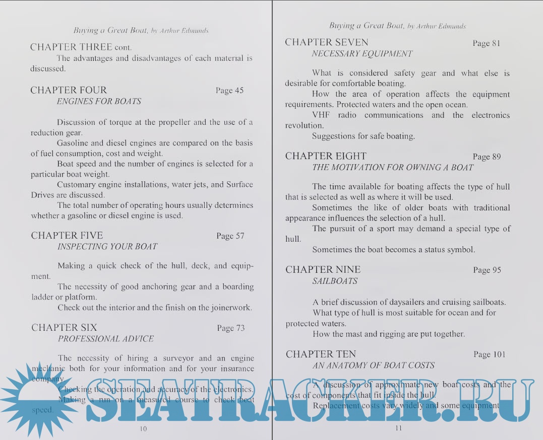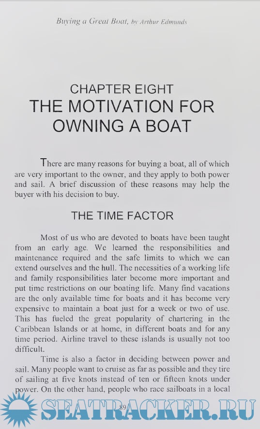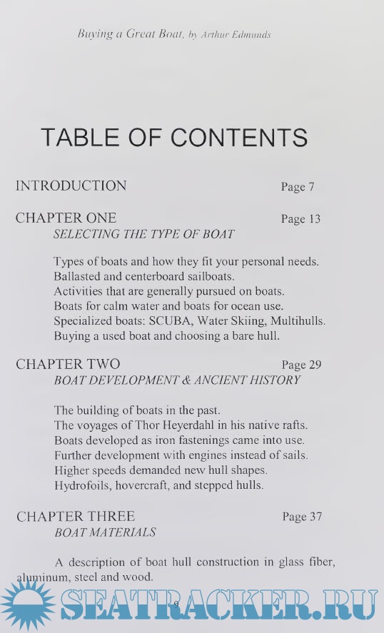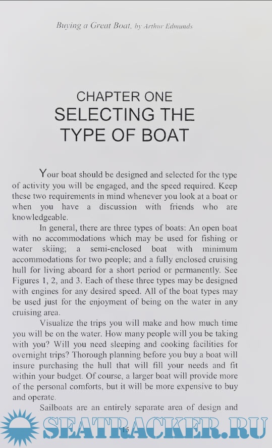Year: 2000 Language: english Author: Arthur Edmunds Genre: Guide Publisher: Bristol Fashion Publications Edition: First ISBN: 978-1892216359 Format: PDF Quality: Scanned pages Pages count: 180 Description: When you go to a boat show or a dealer's showroom, there is an overwhelming number of boat types, styles, engines, and optional equipment. Clearly, we should be thinking about a definite type of boat before we proceed to look at the many available boats, either new or used. This choice should fit your personal preferences concerning the use of the boat and where it will be operated. It is true that a small boat may be used for many different purposes, with the exception of providing sufficient accommodations for living aboard. This book will show the differences in boat types and where each can be used efficiently. This will assist you in making a decision for the correct boat to fit your needs and to fit the time available for enjoying the pleasures of being on the water. Surely, all of us would like to have a large boat with all the comforts of home, but most of us only have a few hours each weekend in which to enjoy floating on the water. A small boat under thirty feet in length may satisfy your requirements if you have little time to spend afloat. On the other hand, if you want to live on the boat permanently, or take long cruises during your vacation time, a longer boat will provide those necessary arrangements and storage. We are not only interested in the hull and interior, but the engine type is of prime importance as this is what gets us to our objective. Engine types and costs will be discussed and the advantages of each explained. Our own preferences largely determine what boat we will buy and each individual should find the most desirable boat described within these pages. We hope you will enjoy cruising as much as we have.
