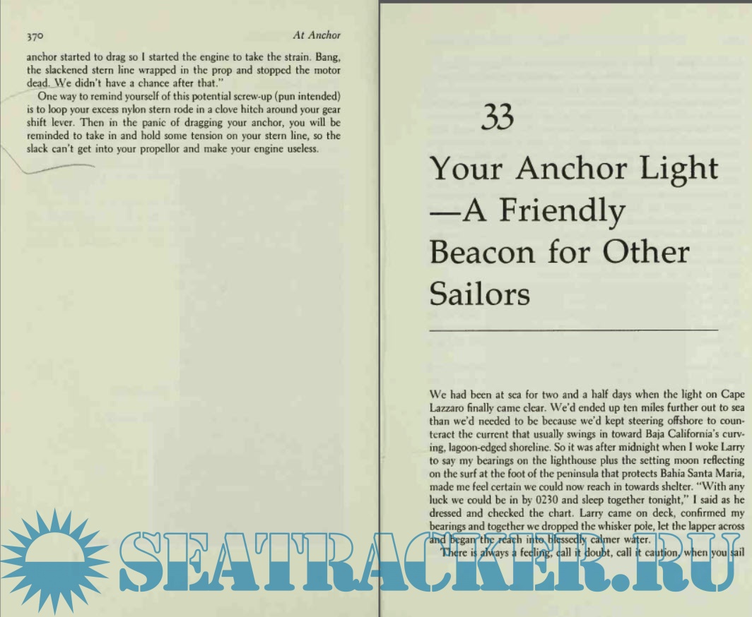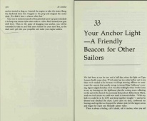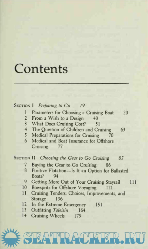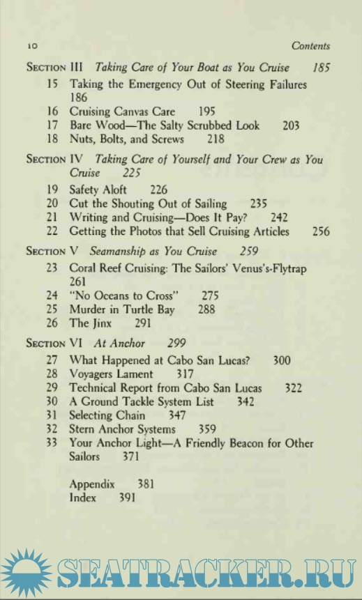 The second section is all about gear, and discusses a number of subjects that I have not previously seen addressed in print. Among the chapters is one about positive flotation, with an emphasis on emergency flotation of heavier cruising boats through the use of inflatable bladders. At the time of writing the authors had not installed such a system despite thorough study. It is a shame that this excellent idea has not, as far as I know, seen much development over the several years since this book was written. As the Pardeys point out, it would a fairly complicated product to develop and market, with a very small potential customer base, so there is little incentive for capital to gravitate toward the idea. Maybe someone else will take it up, perhaps with the emphasis on owner-designed and –built systems made of already-available components. I could think of worse places for some government grant money to go.