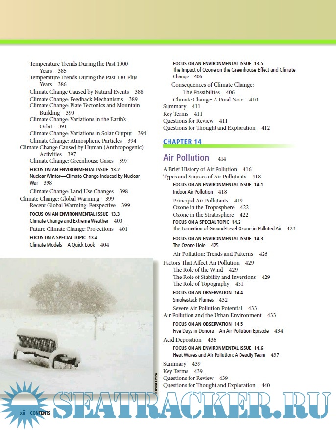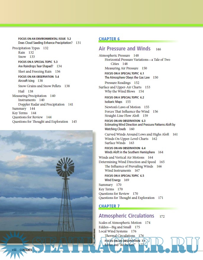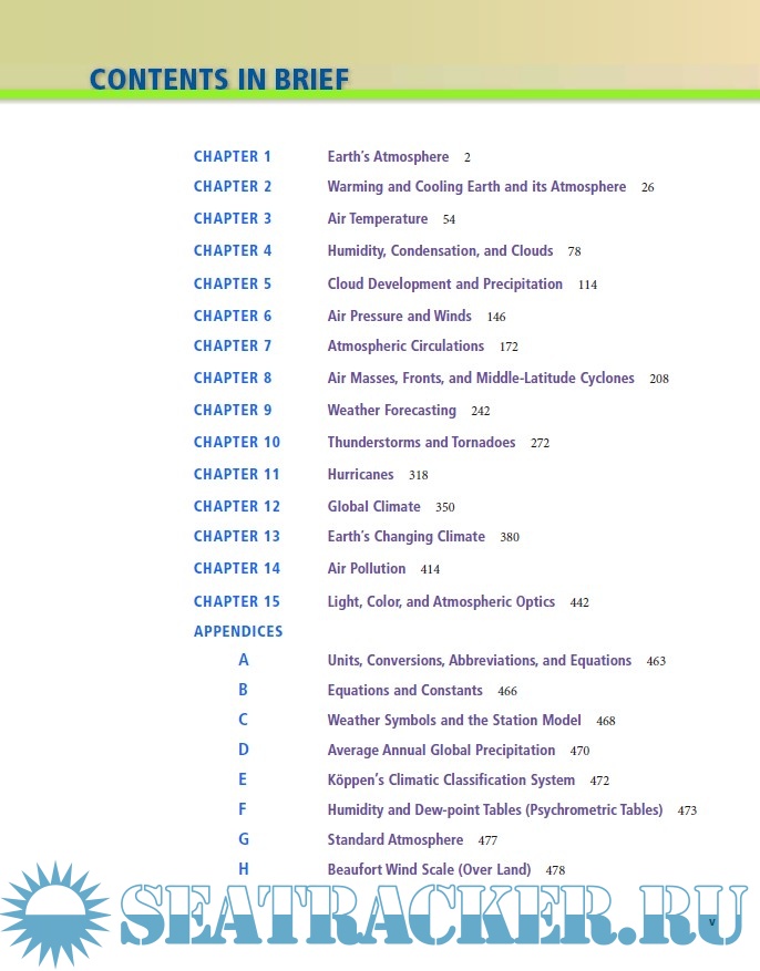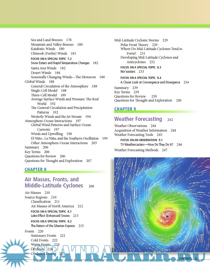 Year: 2018 Language: english Author: C. Donald Ahrens, Robert Henson Genre: Manual Publisher: Cengage Learning Edition: 8th Edition ISBN: 978-1-305-62845-8 Format: PDF Quality: eBook Pages count: 537 Description: Essentials of Meteorology is written for students taking an introductory course on the atmospheric environment, and for meteorology instructors who need a reference manual to be fully exploited. The main purpose of the text is to convey meteorological concepts in a visual, practical, and non-mathematical manner. In addition, the intent of the book is to stimulate curiosity in the reader, and to answer questions about weather and climate that arise in our day-to-day lives. Although introductory in nature, this eighth edition maintains scientic integrity and includes up-to-date information on large-scale topics, such as global warming, ozone depletion etc. As in previous editions, no special prerequisites are necessary for understanding. The text encourages watching the weather so that it becomes “alive”, allowing readers to immediately apply textbook material to the world around them. To assist with this endeavor, a color Cloud Chart appears at the back of the text, that can be used used as a learning tool. To strengthen points and clarify concepts, illustrations are rendered in full color throughout. Several appendices, that were only available online, have been reincorporated. Organized into fifteen chapters, Essentials of Meteorology is designed to provide maximum fexibility to instructors of weather and climate courses. Thus, chapters can be covered in any desired order. For example, Chapter 15, “Light, Color, and Atmospheric Optics,” is self-contained and can be covered earlier if so desired. Focus sections fall into one of three distinct categories: Observations, Special Topics, and Environmental Issues. Some include material that is not always found in introductory meteorology textbooks—subjects such as space weather, the scientific method, and wind energy. Others help to bridge theory and practice. Set apart as “Did You Know?” features in each chapter is weather information that may not be commonly known.