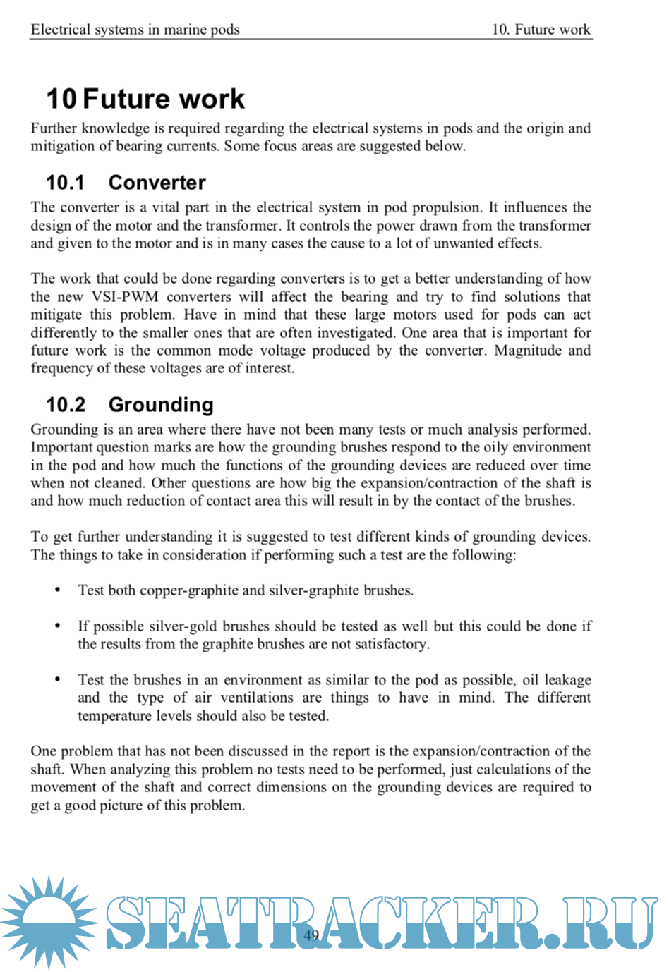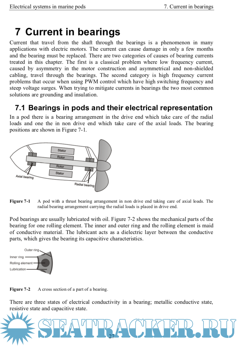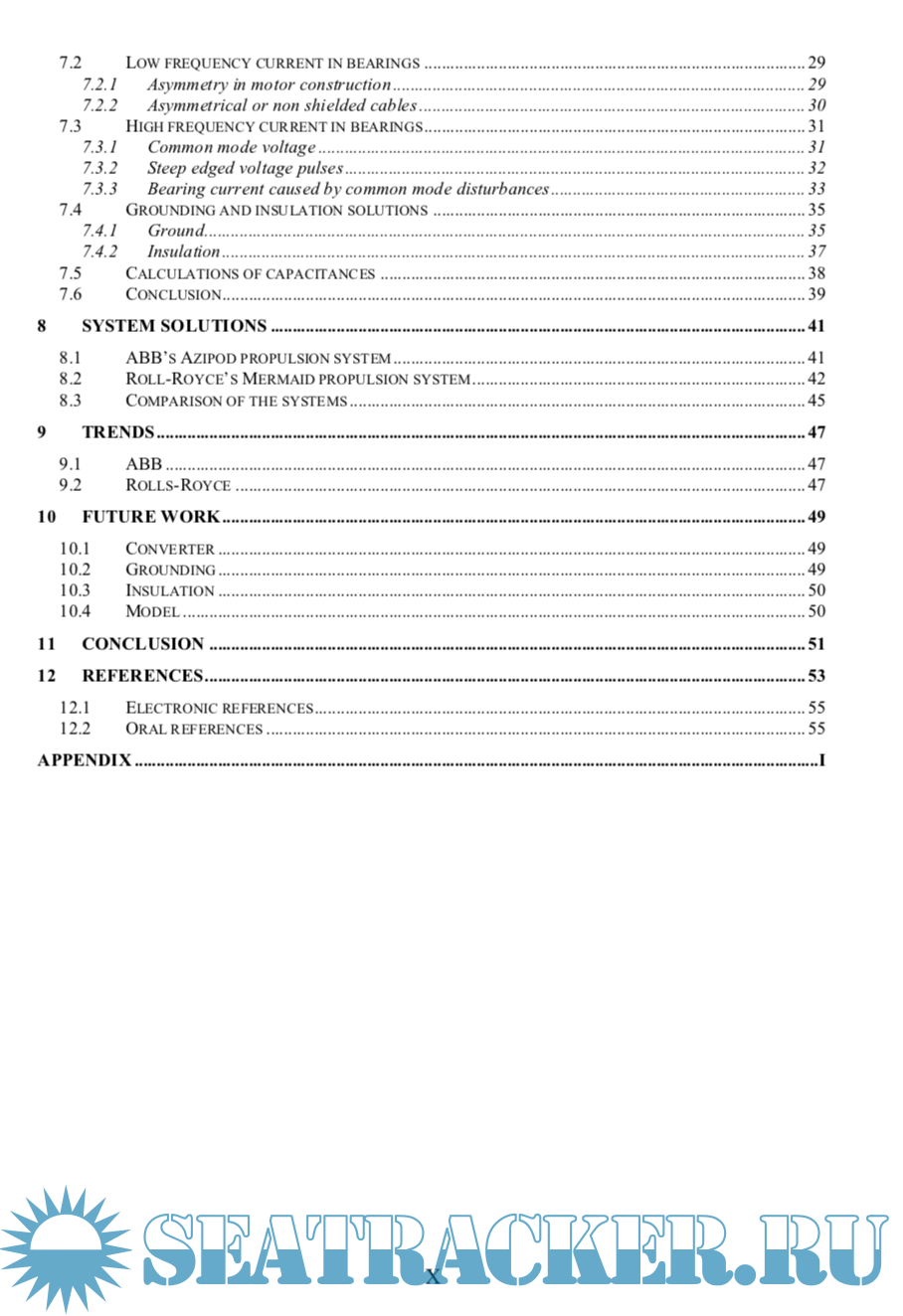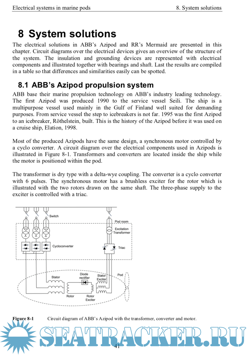 Azipod has a synchronous motor controlled by a cyclo converter and dry type transformer. The non-drive end bearing is insulated and the shaft is grounded to earth in drive end and to the bearing housing in non-drive end. Mermaid has a dry type transformer and a synchronous motor controlled by a load commutated inverter (LCI). Both bearings are insulated and the shaft is grounded at the drive-end.