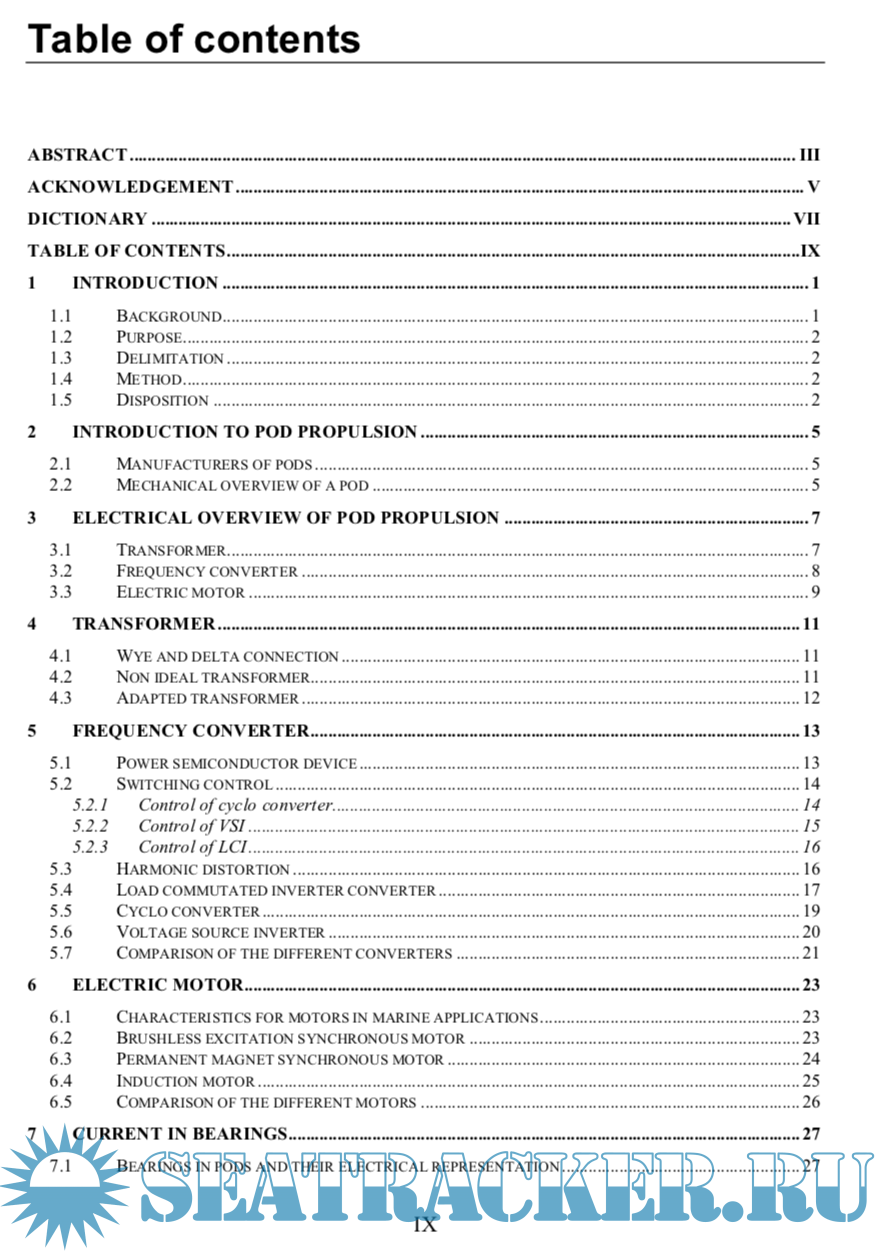 The electrical system in pod propulsion normally consists of a transformer, a frequency converter and an electric motor. The transformer is used to divide the system into several parts in order to obtain different voltage levels but also for phase shift voltages for the used rectifiers. The purpose of the frequency converter is to control the speed and torque of the motor by changing a constant frequency from the main generator into variable frequency for the motor. The electric motor is used for conversion from electrical to mechanical power for the propeller.
