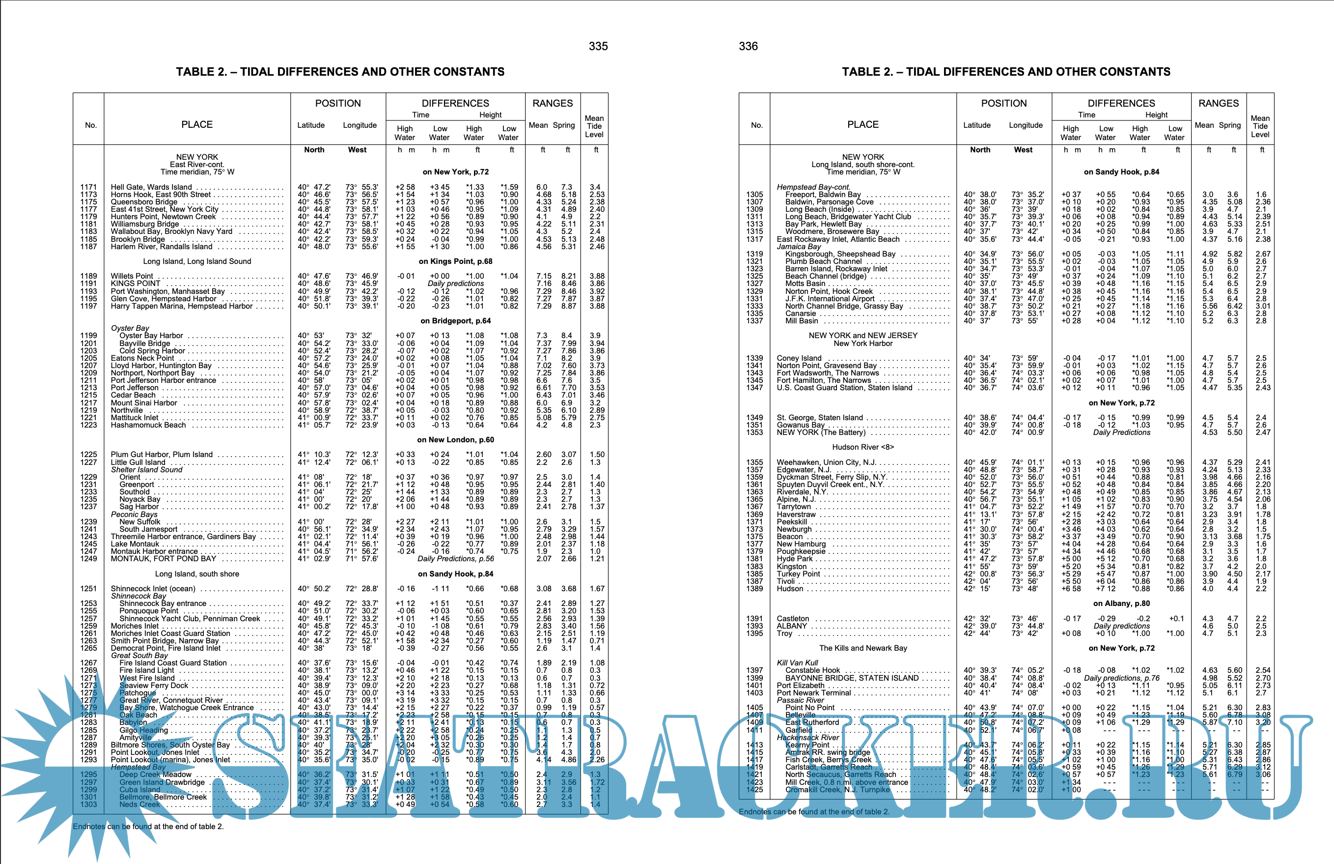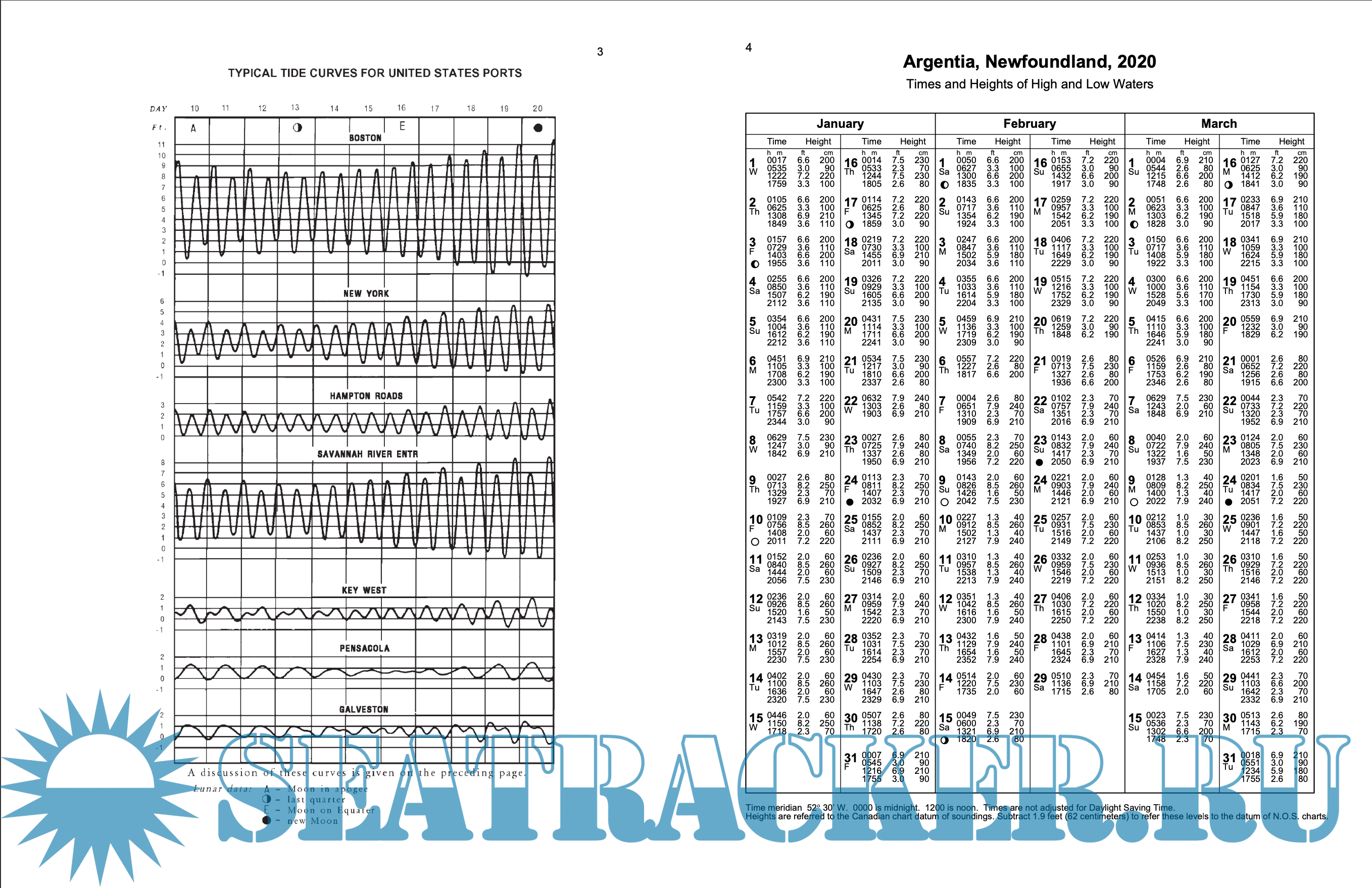 Description: Contains full daily predictions for 76 reference ports and differences and other constants for about 2,600 stations in North America, South America, and Greenland. It also contains a table for obtaining the approximate height of the tide at any time, a table of local mean time of sunrise and sunset for every 5th day of the year for different latitudes, a table for the reduction of local mean time to standard time, a table of moonrise and moonset for 8 places, a table of the Greenwich mean time of the Moonsí phases, apogee, perigee, greatest north and south and zero declination, and the time of the solar equinoxes and solstices, and a glossary of terms. This book comes is published as one part in a set of four volumes, along with Europe and West Coast of Africa (including the Mediterranean Sea)