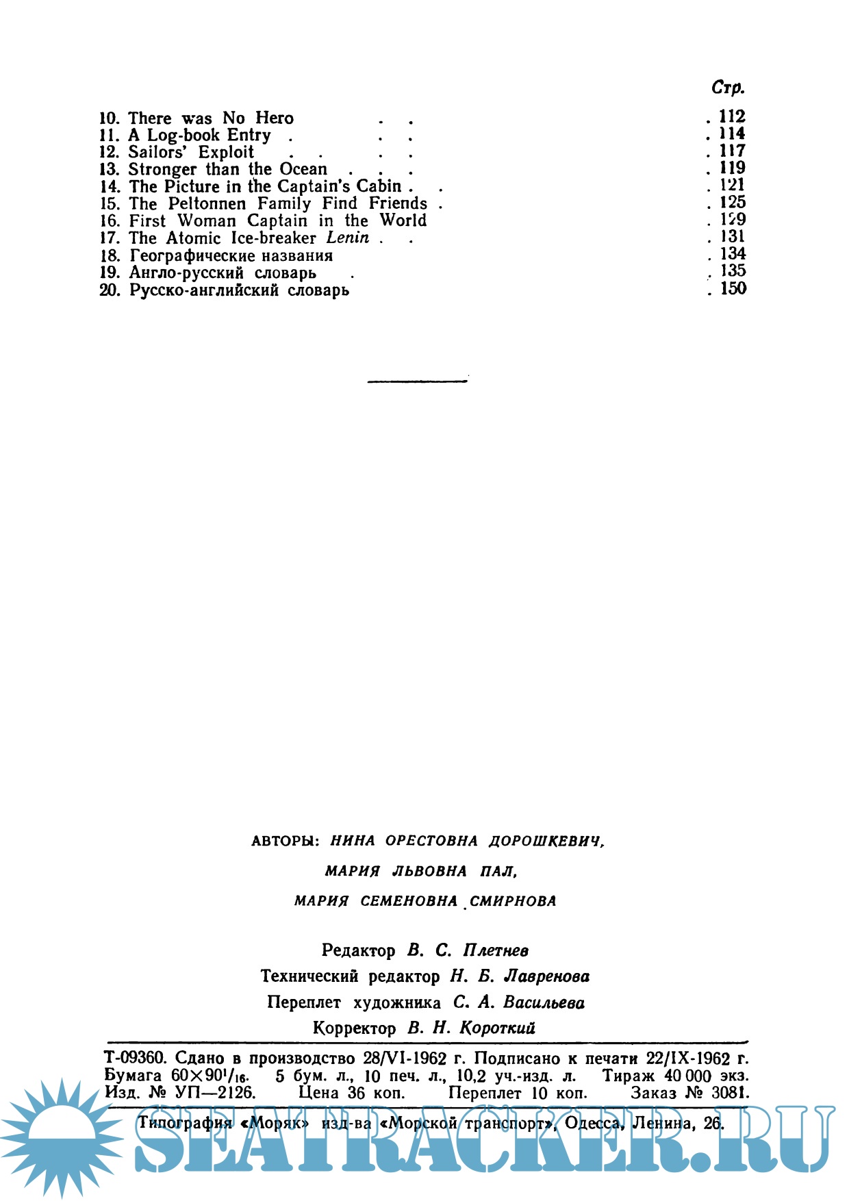 Год выпуска: 1962 Язык: русский / english Автор: Уайзер Г.М. ред. Жанр: Textbook Издательство: Морской транспорт Формат: PDF Качество: Отсканированные страницы Количество страниц: 163 Описание: Перед курсантами морских училищ наряду с задачей овладения чтением и переводом английской литературы стоит также задача овладения навыками устной речи, что вытекает непосредственно из специфики работы на морском флоте. Плавание в иностранных водах и необходимость общения с представителями портовых, таможенных и других властей зарубежных стран требует от работника морского флота широкого и ответственного использования английского языка.Данный курс английского языка предназначен для лиц, начинающих изучать английский язык в морских училищах. Он может быть использован и продолжающими изучать английский язык. В этом случае в целях более прочного закрепления морской лексики и систематизации грамматического материала рекомендуется пройти более ускоренным темпом материал первых уроков, начав с тех, которые соответствуют уровню знаний учащихся.Тематика текстов книги преимущественно общеморская, что дает возможность пользоваться ею на всех факультетах и специальностях морских училищ. Большинство текстов представляет собой оригинальный, лишь несколько адаптированный материал. Адаптация заключалась, в основном, в сокращении текстов и замене редко употребляемых слов и выражений часто употребляемыми.