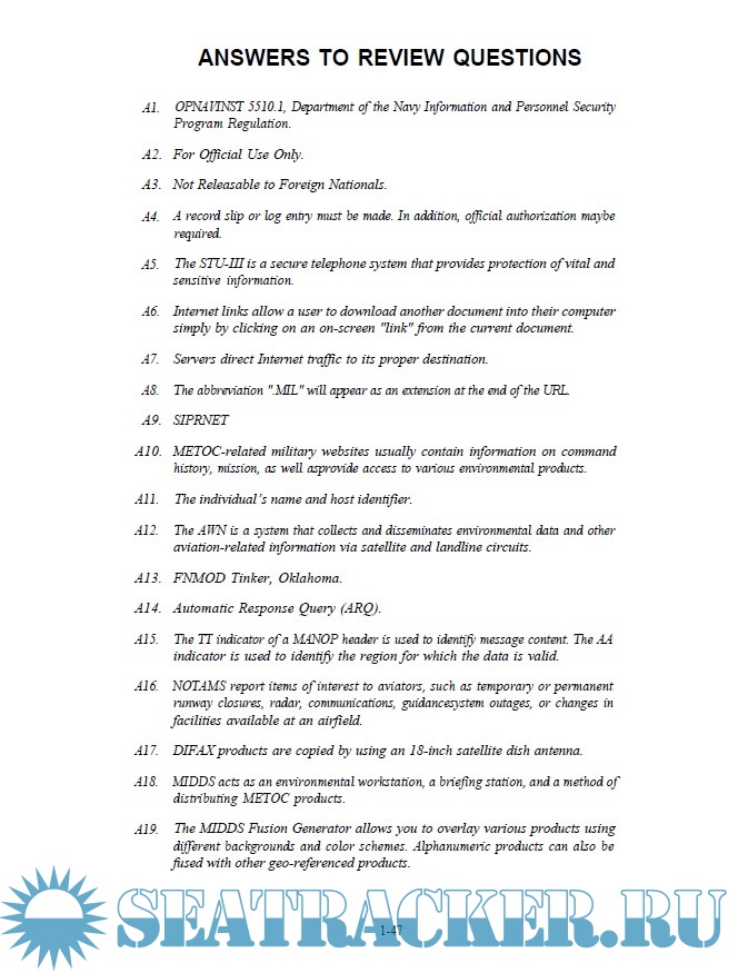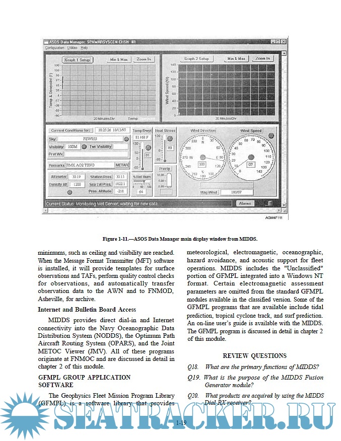 Year: 1999 Language: english Author: US Navy Genre: Textbook Format: PDF Quality: eBook Pages count: 130 Description: Aerographer’s Mates are enlisted sailors who monitor sea conditions, analyze meteorological data, and develop accurate forecasts. Their responsibilities include: being the Navy’s meteorological and oceanographic experts, distributing weather data, collecting, recording and analyzing weather and oceanographic information, making visual and instrument observations of weather and sea conditions, interpreting satellite data, radar imagery, and meteorological and oceanographic codes. This US Navy self-study course is organized into subject matter areas, each containing learning objectives along with text and illustrations, in order to help understanding. The subject matter reflects day-to-day requirements and experiences of personnel in the rating or skill area. This module covers several of the most widely used environmental communications systems within the METOC community. It also describes the software programs and products associated with these systems. The module concludes with a discussion of basic administration procedures. Additional info: Non-resident Training Course (Selfstudy) textbook 4 of 5