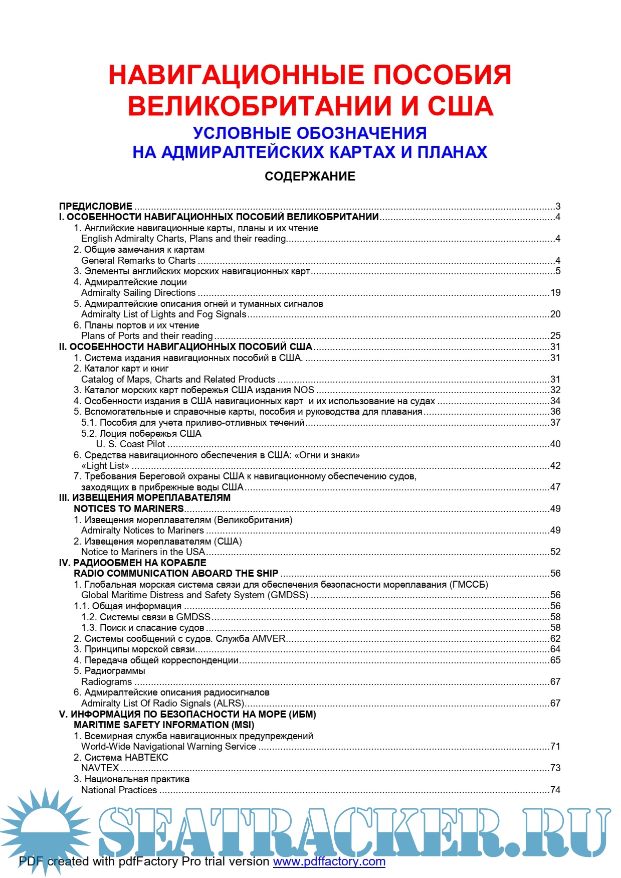 Описание: Задачей данной книги является систематизация информации об основных особенностях использования навигационных пособий Великобритании и США. Рассматривается не только структура пособий, но и особенности их использования судоводителями, проводятся аналогии с отечественными. Приведен перевод на русский язык условных обозначений и сокращений, употребляемых в Адмиралтейской карте № 5011. Это позволит специалистам, встречающихся с навигационными пособиями Англии и США, в короткий срок детально ознакомиться с ними и использовать в повседневной деятельности с максимальной отдачей.