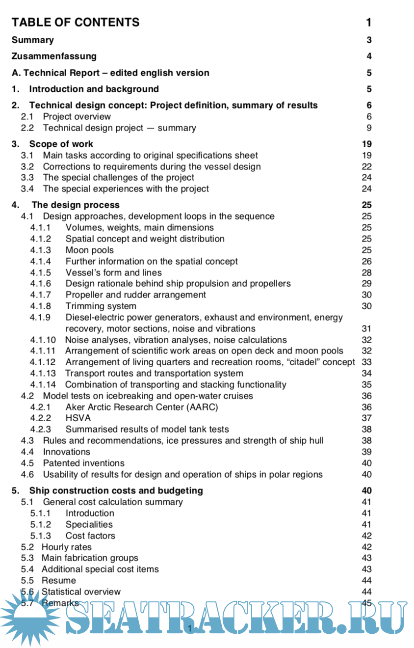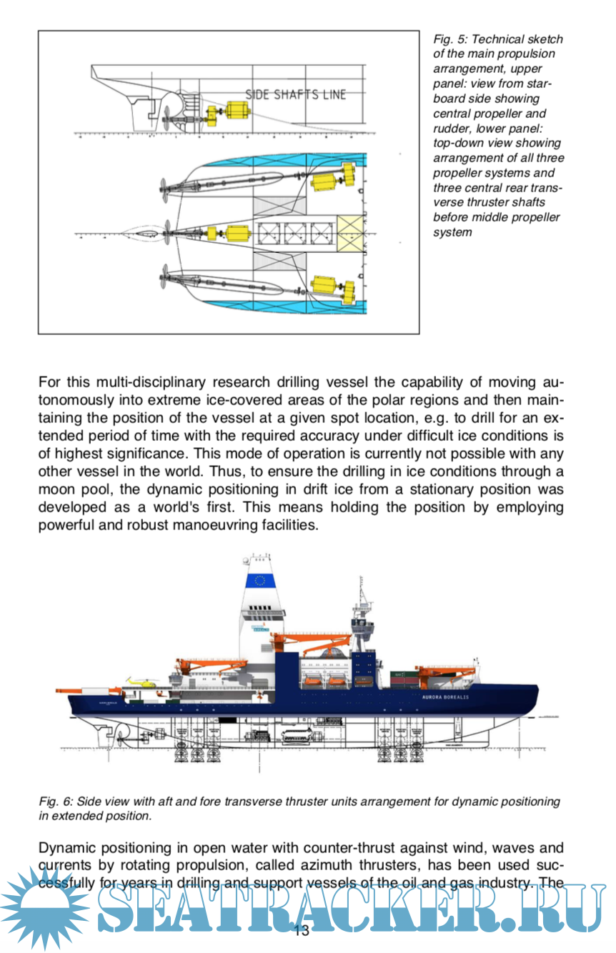 Description: Dedicated research vessels that are capable to operate during all seasons of the year and under unfavourable weather conditions in the central Arctic Ocean and in the Southern Ocean are required to fulfil the new needs of polar ocean research for all marine disciplines. Today, no available research vessel has these required capabilities. Thus, the initiative was taken to develop a novel and dedicated research icebreaker with technical capabilities hitherto unrealised, which will enable the vessel to autonomously operate in the Arctic Ocean even during the severest ice conditions in the deep winter serving all marine disci- plines of polar research including deep-sea drilling: The AURORA BOREALIS. The technical conceptual design of this research icebreaker with scientific deep- sea drilling capability AURORA BOREALIS is summarised in this report.