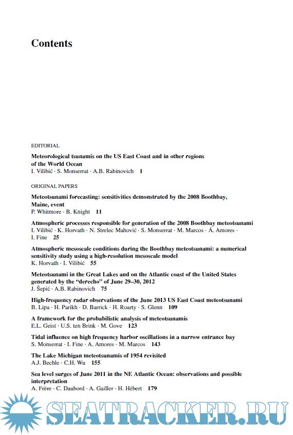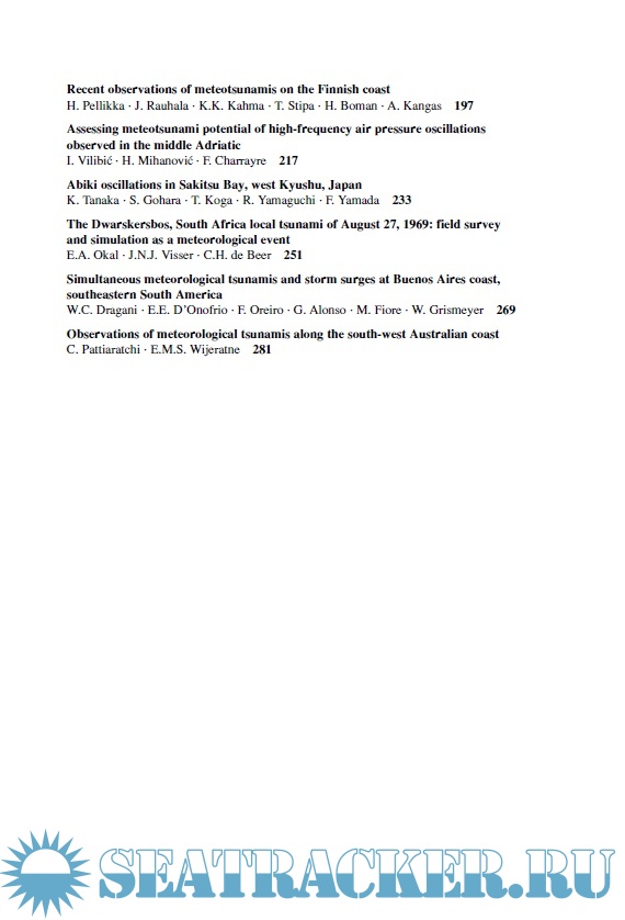 The book encompasses a set of articles on meteorological tsunamis, covering various aspects on this phenomenon. Altogether an editorial and 15 contributions are part of this book; eight of the contributions deal with different aspects of meteotsunamis along the U.S. East Coast and in the region of the Great Lakes, including one paper introducing a new methodology in meteotsunami research. Seven more papers are documenting meteotsunamis in various coastal areas of the world oceans, such as Gulf of Finland and Adriatic Sea. All continents, except Antarctica, have been covered, with the authors representing 11 countries.