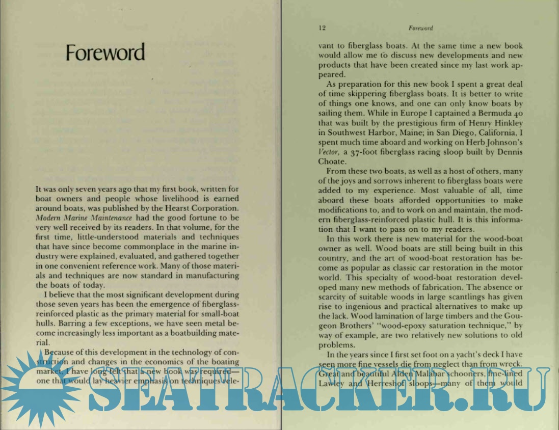 Year: 1985 Language: english Author: John Duffett Genre: Guide Publisher: W W Norton & Co Inc Edition: First ISBN: 0-393-03279-5 Format: PDF Quality: Scanned pages Pages count: 213 Description: Here is a complete reworking and updating of the classic Modern Marine Maintenance, which has been called "the most useful single-volume book on boat maintenance for the amateur owner. " It is a mandatory book for anyone who does any of his or her own work. This book is the complete guide to maintaining the integrity and beauty of wood, fiberglass, aluminum, steel, and ferro-cement boats. It instructs both the experienced and the beginner in the fundamentals of construction, the repair of both minor and major defects, the tools to use (and those not to use), and materials, and gives shortcuts to sound repair. Here also is how to inspect for damage and wear, which routines to follow to prevent trouble, and what to do when trouble happens. For the skilled and the unskilled, this book is a basic necessity for anyone who owns a boat, power or sail, large or small.
